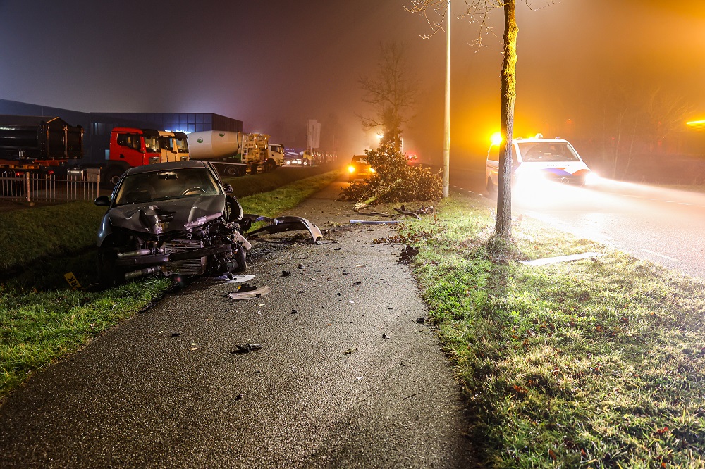 Automobilist rijdt boom uit de grond, auto zwaar beschadigd
