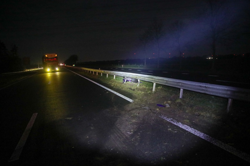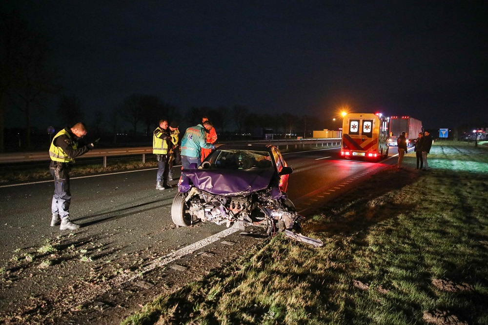 De weg is volledig afgesloten, met verkeer dat via een tankstation wordt omgeleid. Vrachtwagenchauffeurs zorgden vooraf voor een veilige afzetting. De auto liep flinke schade op en is afgesleept. De politie onderzoekt het ongeval.