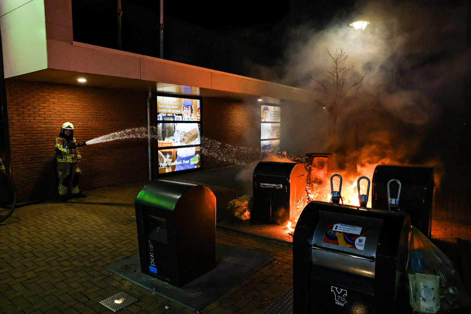 Een stapel afval tussen enkele containers was in brand gestoken. Door enkele deodorantbussen ontstonden knallen, maar de brandweer had het vuur snel onder controle.