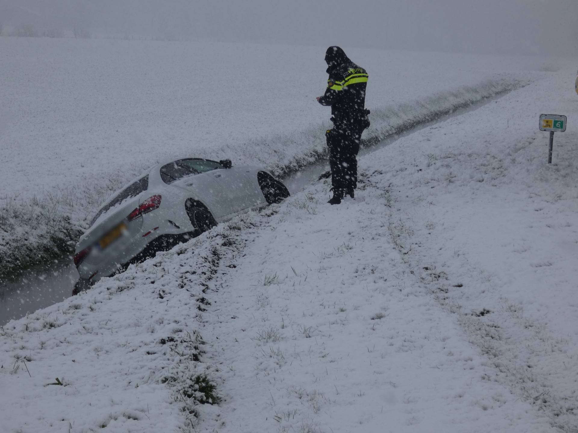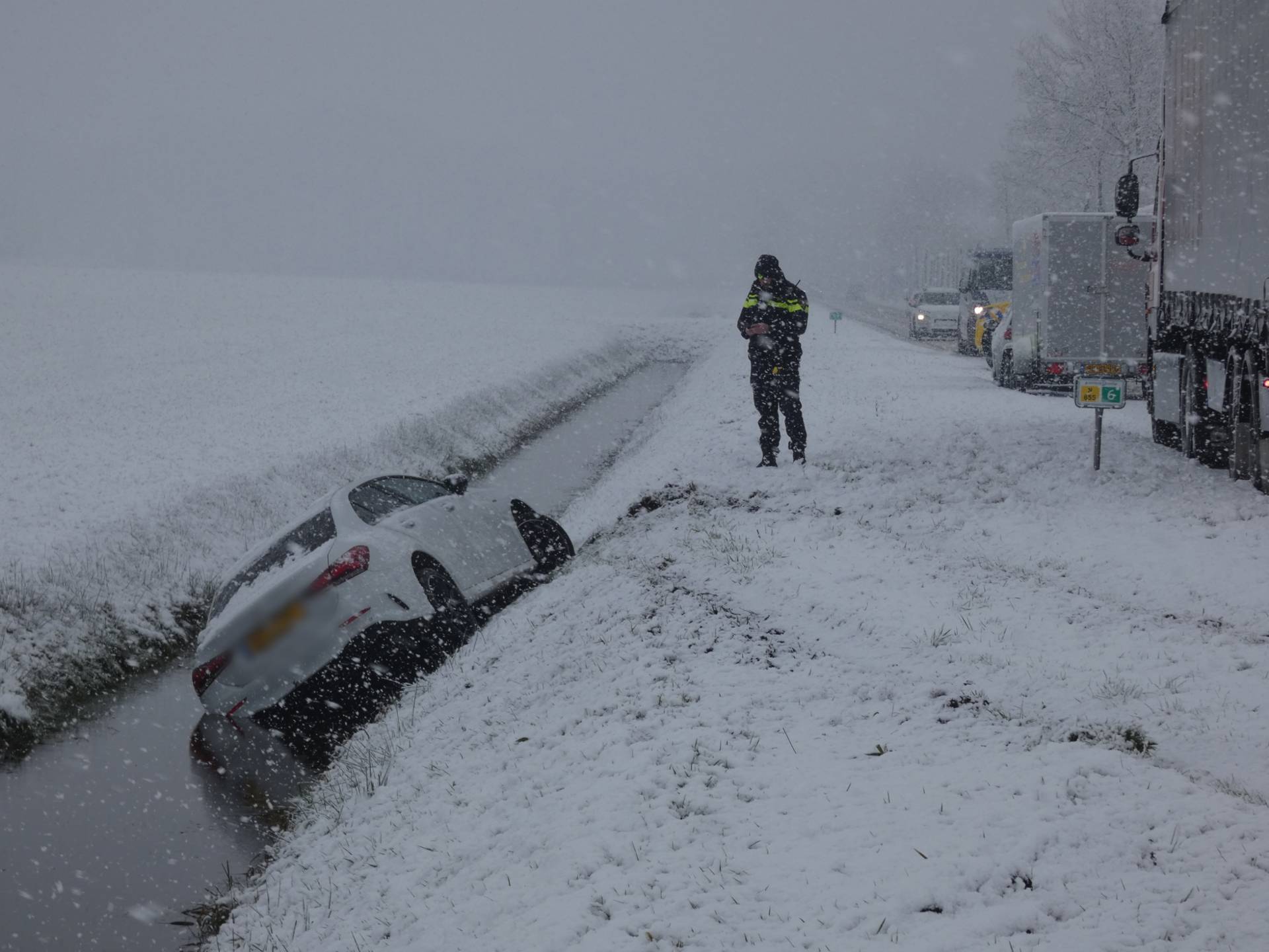 Een auto raakte door de sneeuw en gladheid van de weg en kwam in een sloot terecht. De bestuurder kon zelfstandig het voertuig verlaten. Het verkeer ondervindt lichte hinder van het ongeval. De bestuurder hield geen letsel over aan het ongeval.