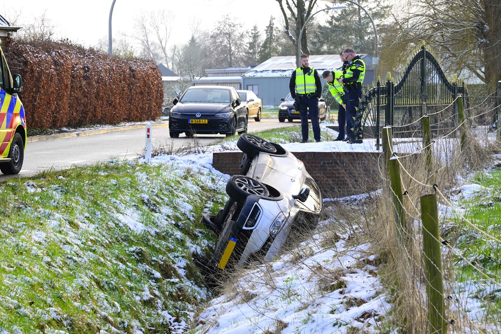 Met hulp van omstanders wist de bestuurder uit de auto te komen. Een ambulance is ter plaatse voor controle.