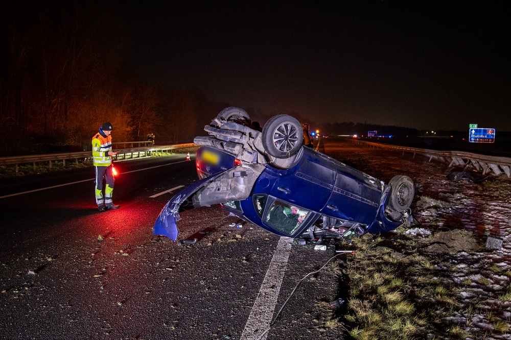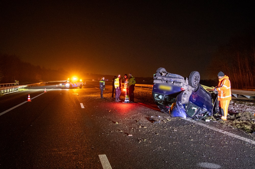 Een automobilist raakte door nog onbekende oorzaak van de weg, botste tegen de middengeleider en kwam uiteindelijk op de kop tot stilstand midden op de weg. Beide rijstroken richting Heerenveen werden afgesloten, terwijl verkeer via de vluchtstrook kon passeren.
