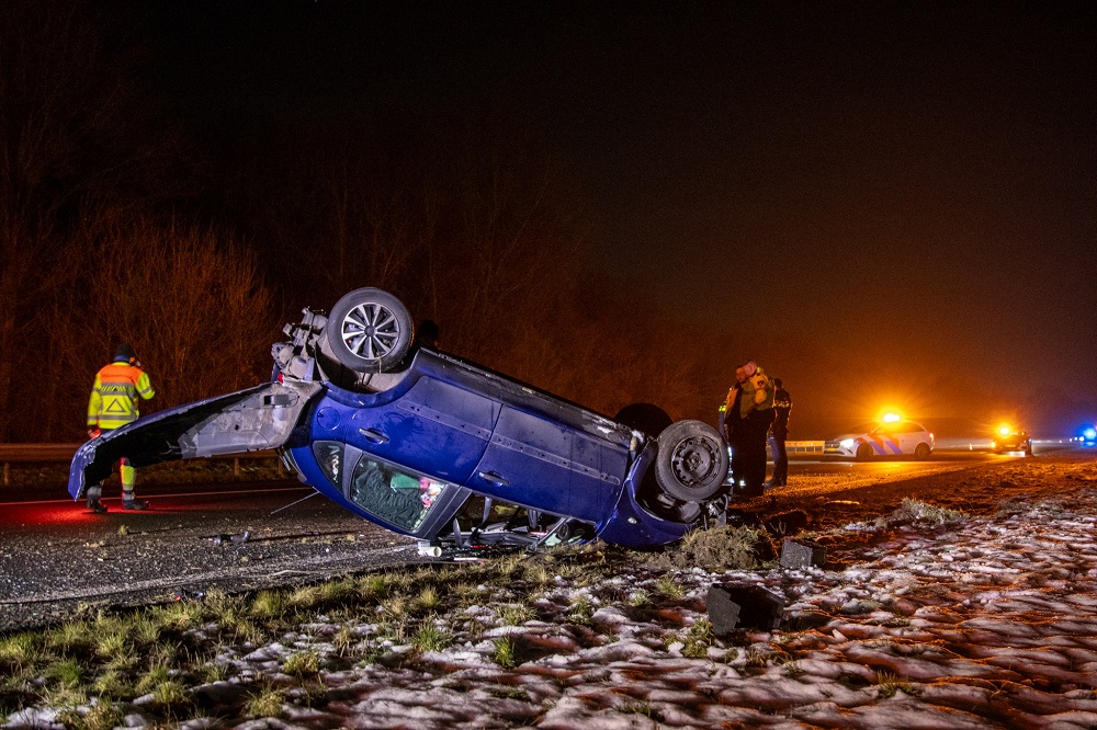 Auto over de kop op snelweg, twee inzittenden gewond