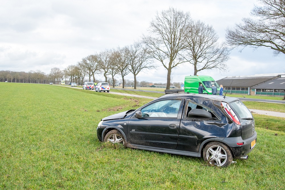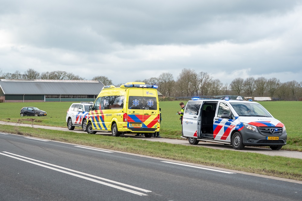 De bestuurder verloor om onbekende reden de controle, kwam in een weiland tot stilstand en is met onbekend letsel naar het ziekenhuis gebracht. De politie gaat mee voor een bloedproef wegens mogelijk rijden onder invloed.