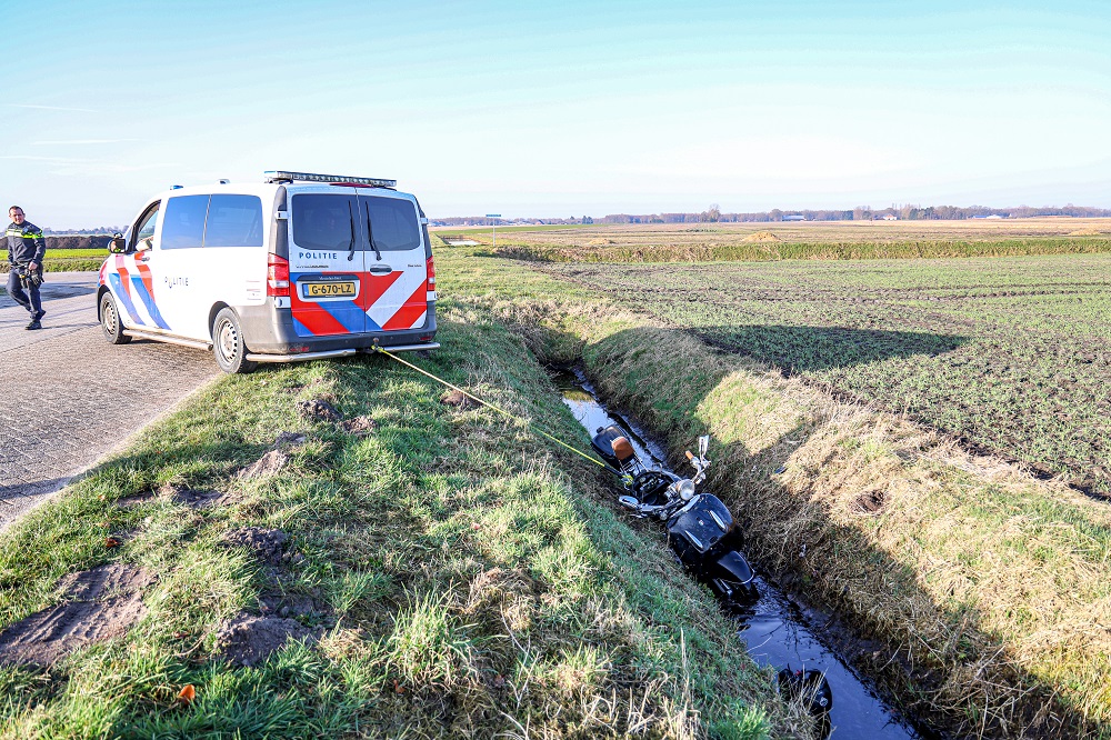 Omstanders ontdekten een scooter in de sloot en sloegen alarm. De politie haalde het voertuig uit het water en trof meerdere bierflesjes aan, wat mogelijk wijst op alcoholgebruik. Van de bestuurder en de kentekenplaat ontbreekt elk spoor.