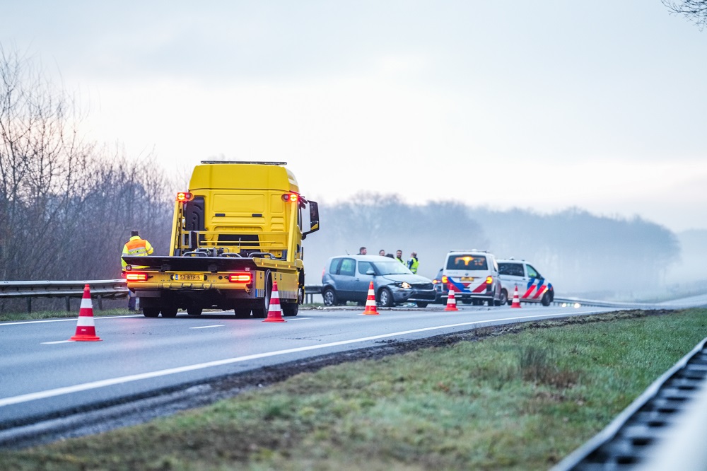 Een bergingsbedrijf is bezig met het wegslepen van de zwaar beschadigde auto. De oorzaak van het ongeval is nog onbekend.