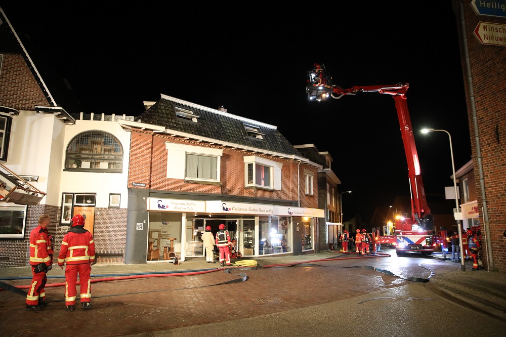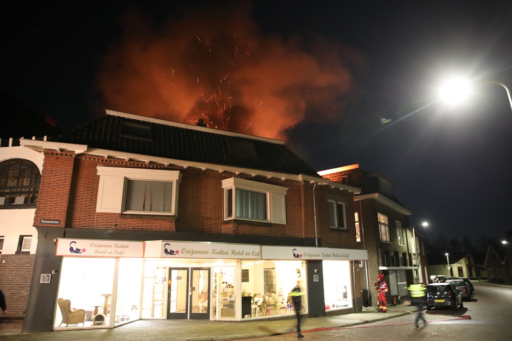 Geplaatst op 7 april 2025, om 07:47 uurSCHEEMDA – In de nacht van zondag op maandag is brand uitgebroken in een woning boven het Ooievaar Kattenhotel aan de Torenstraat. Het vuur ontstond rond 02.15 uur bij de schoorsteen en sloeg snel door het dak. De brand werd opgeschaald naar grote brand.