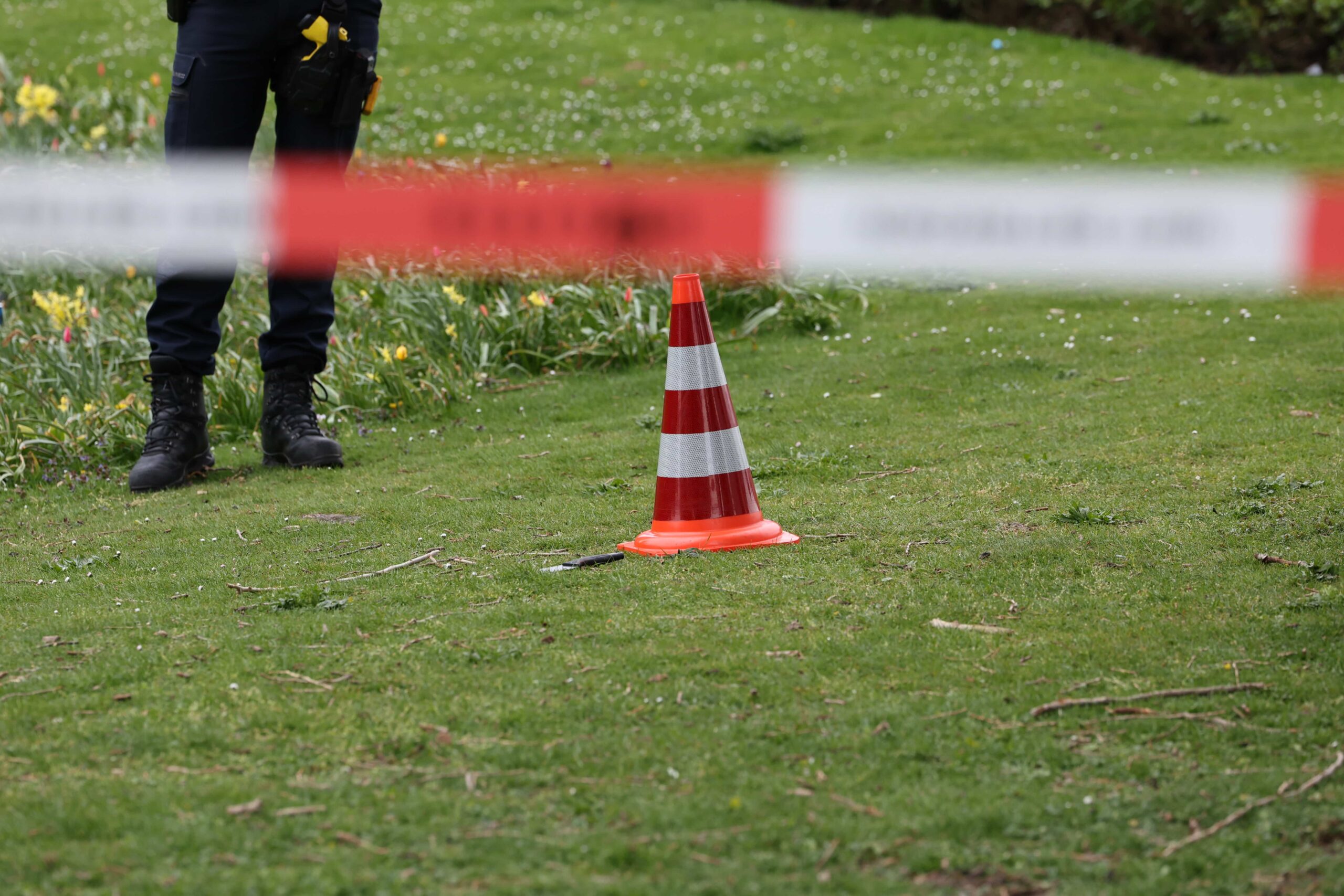 Een man is aangehouden. De politie doet onderzoek op de locatie, waarbij het grasveld gedeeltelijk is afgezet om sporen veilig te stellen.