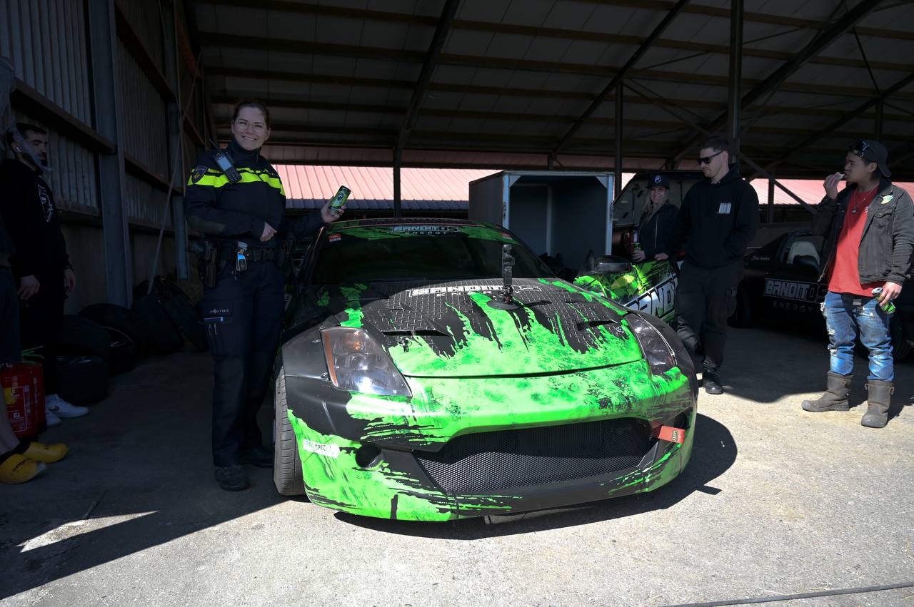 Agenten kwamen ter plaatse om de situatie te bekijken en troffen een georganiseerde driftmeeting aan. Eén van de aanwezige agenten werd door de organisatie uitgenodigd om mee te rijden in een driftauto van Banditos Energy. De agente stapte na het vastzetten met een vierpuntsgordel in en maakte enkele rondes over het terrein.
