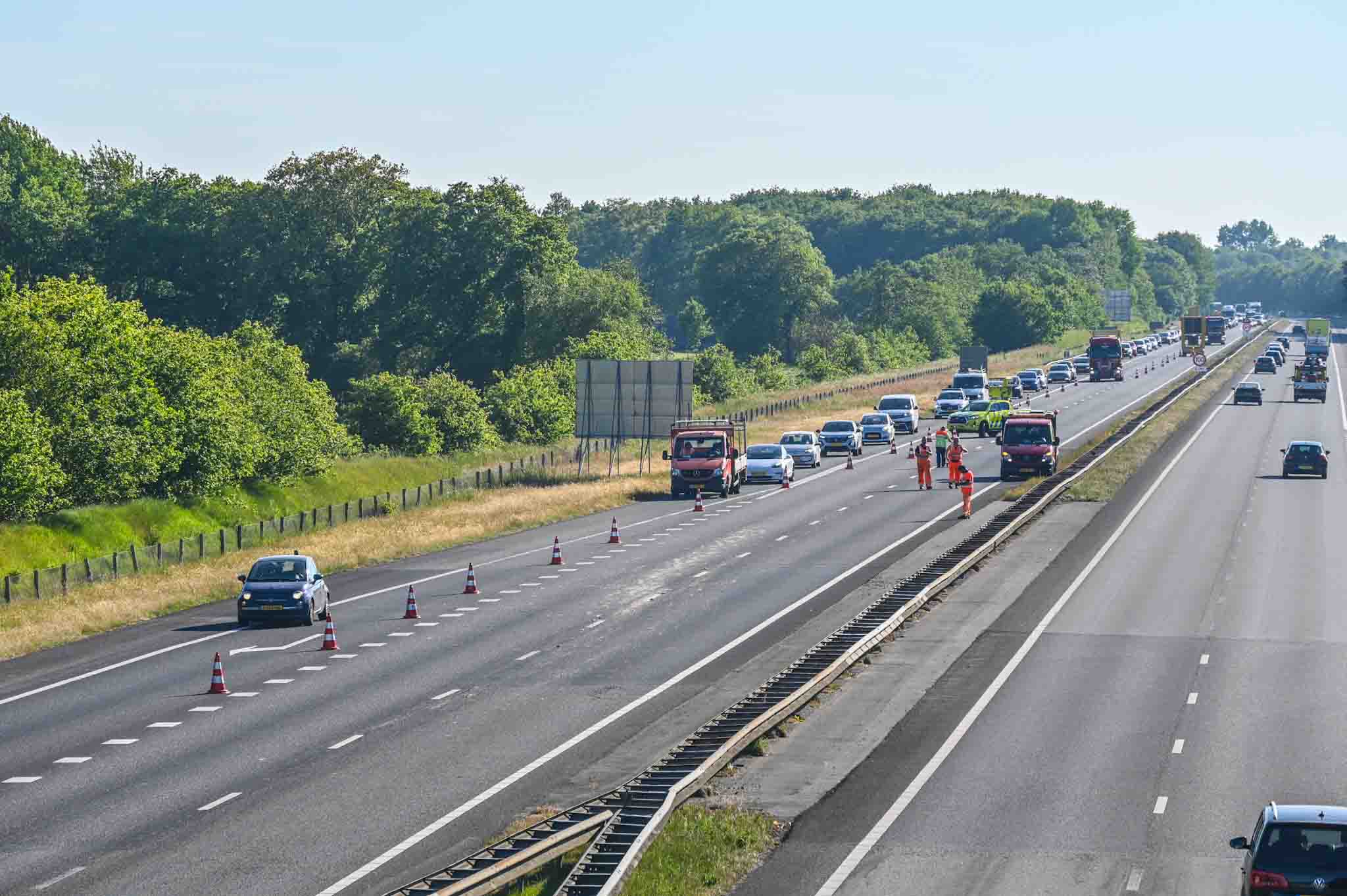 Verkeer wordt via de vluchtstrook langs het incident geleid. Een speciale reinigingswagen, een zogenoemde zoab-cleaner, is onderweg om het wegdek schoon te maken.