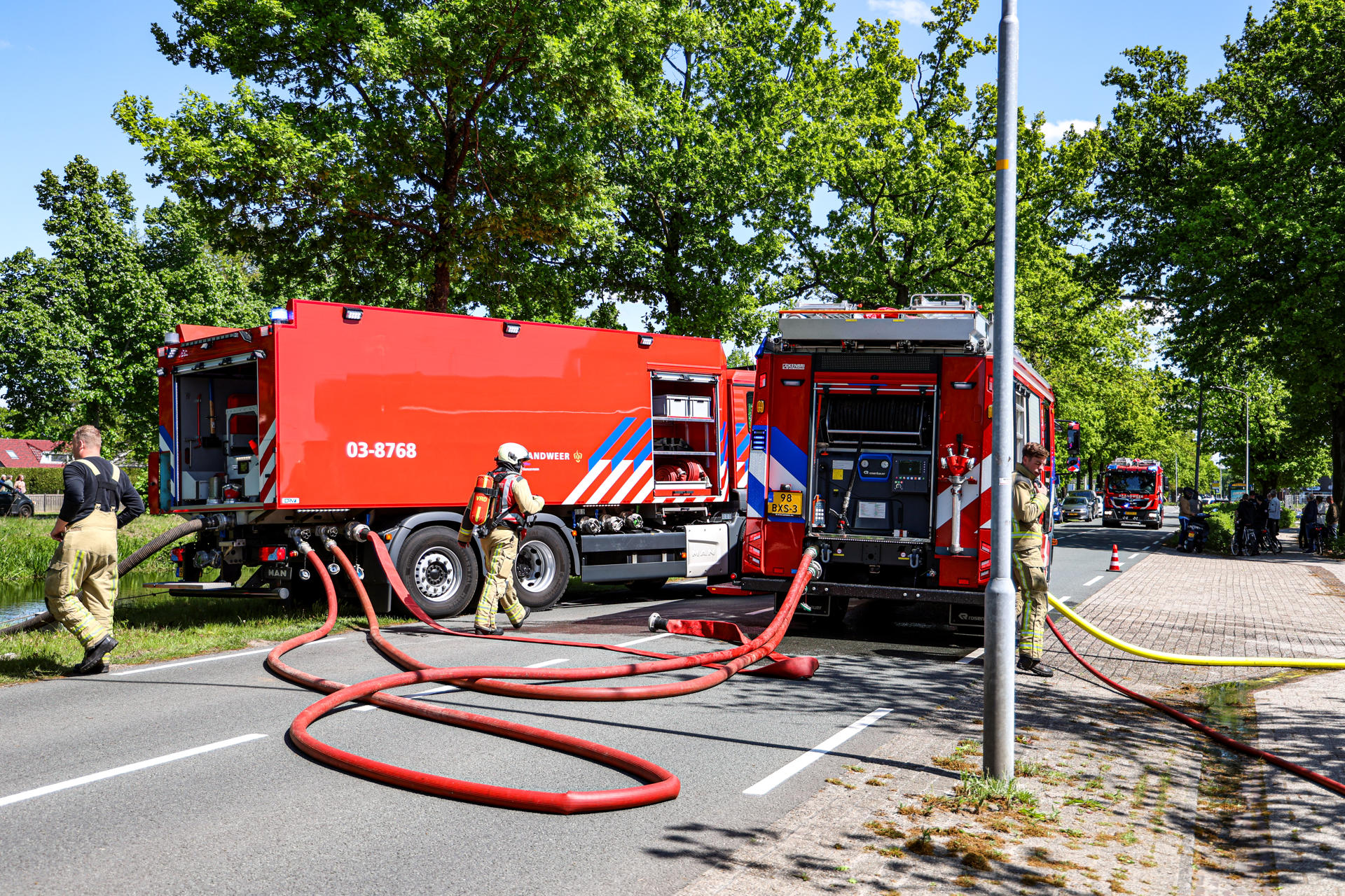 De Eemslandweg is volledig afgesloten en de politie houdt toeschouwers op afstand met lint. Over de oorzaak van de brand is nog niets bekend.