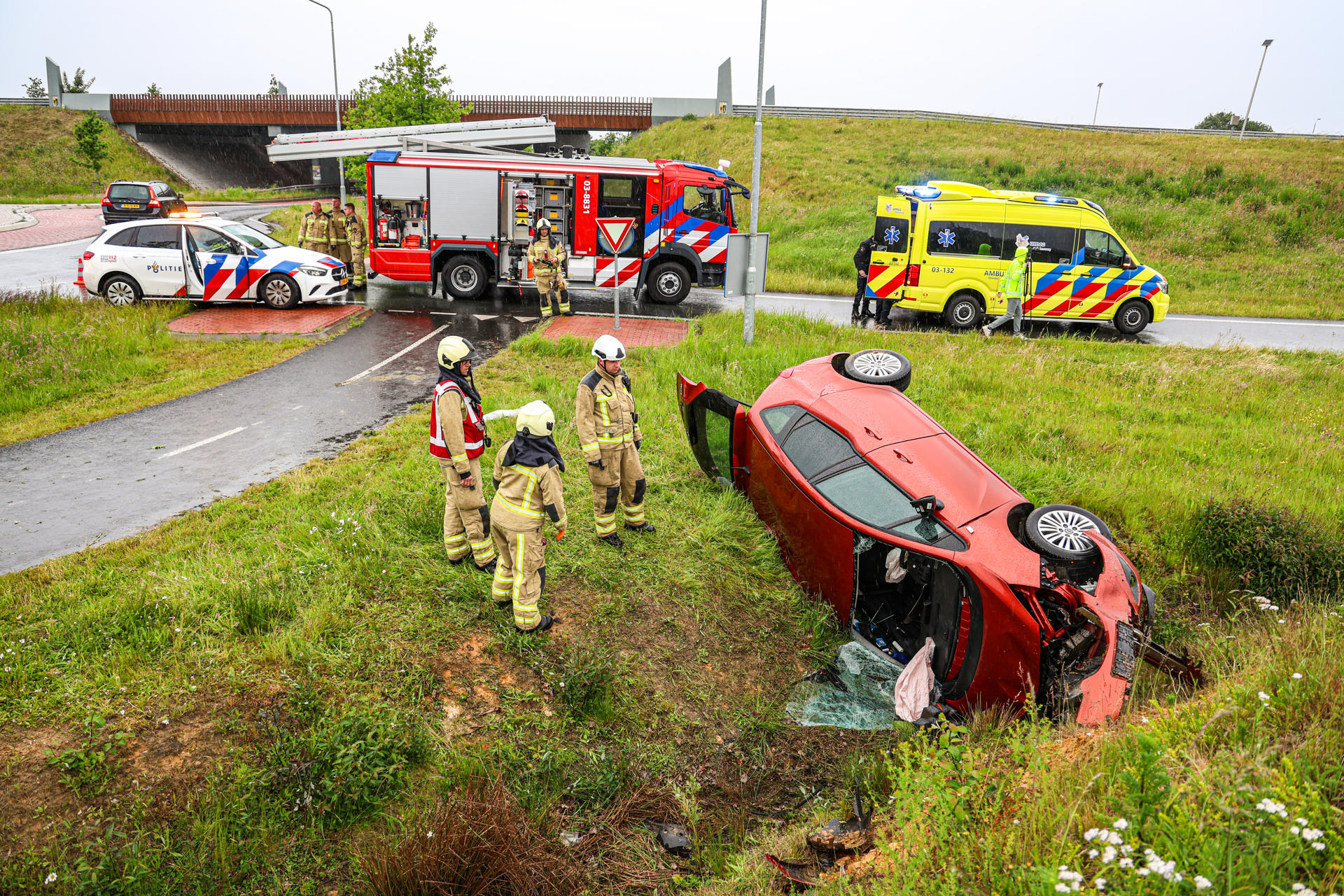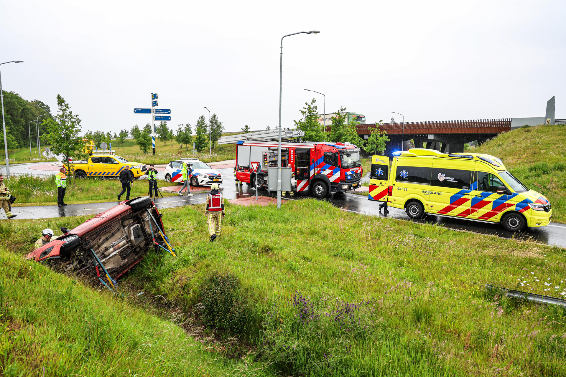 Auto belandt op zijkant na crash bij afrit, bestuurder naar ziekenhuis