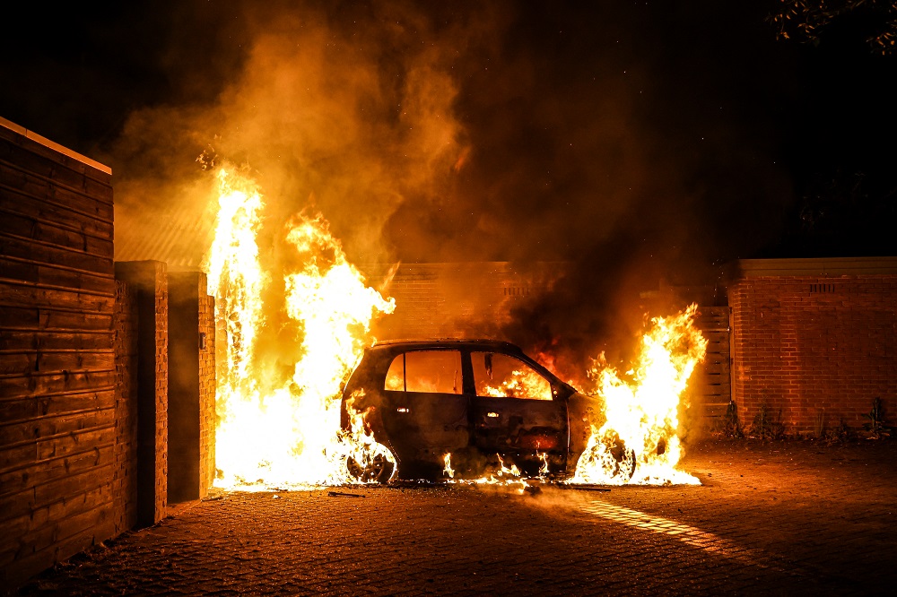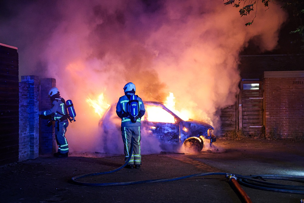 Bij aankomst van de brandweer stonden er al metershoge vlammen. Ondanks snelle inzet kon de auto niet meer worden gered. Ook het schuurtje liep zware schade op.