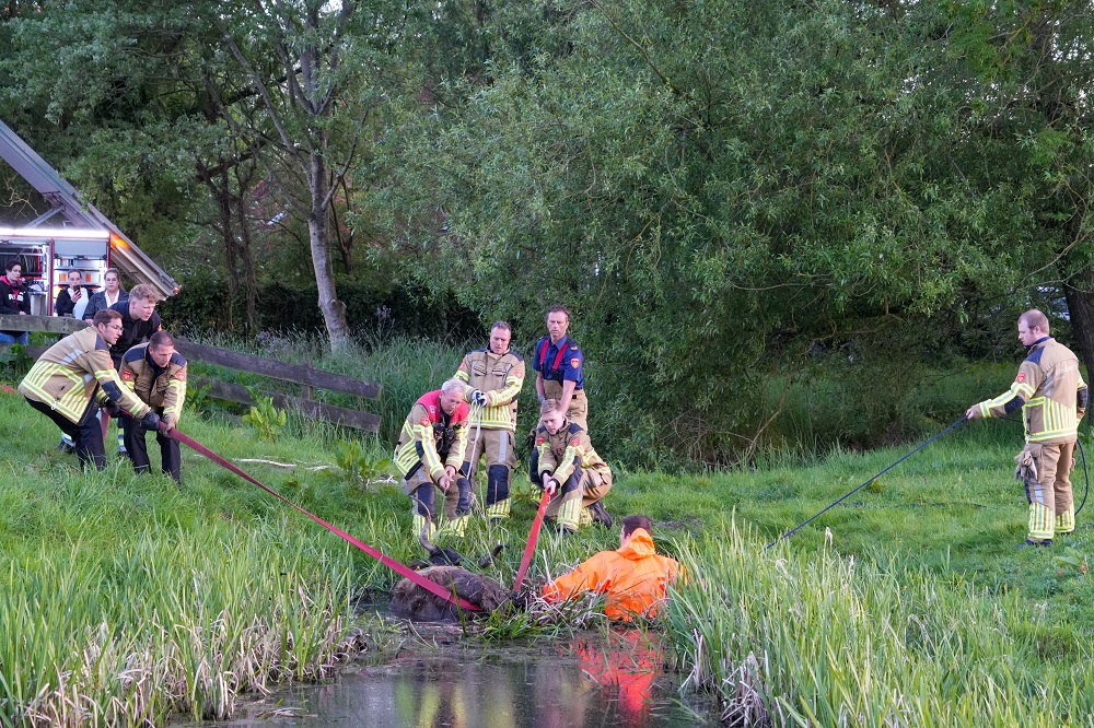 De brandweer had de nodige moeite om het dier op het droge te krijgen en riep zelfs een hulpverleningsvoertuig met kraan op. Uiteindelijk bleek die inzet niet nodig. De Hooglander kwam vies, maar ongedeerd uit het water en kon zijn weg vervolgen in het weiland.