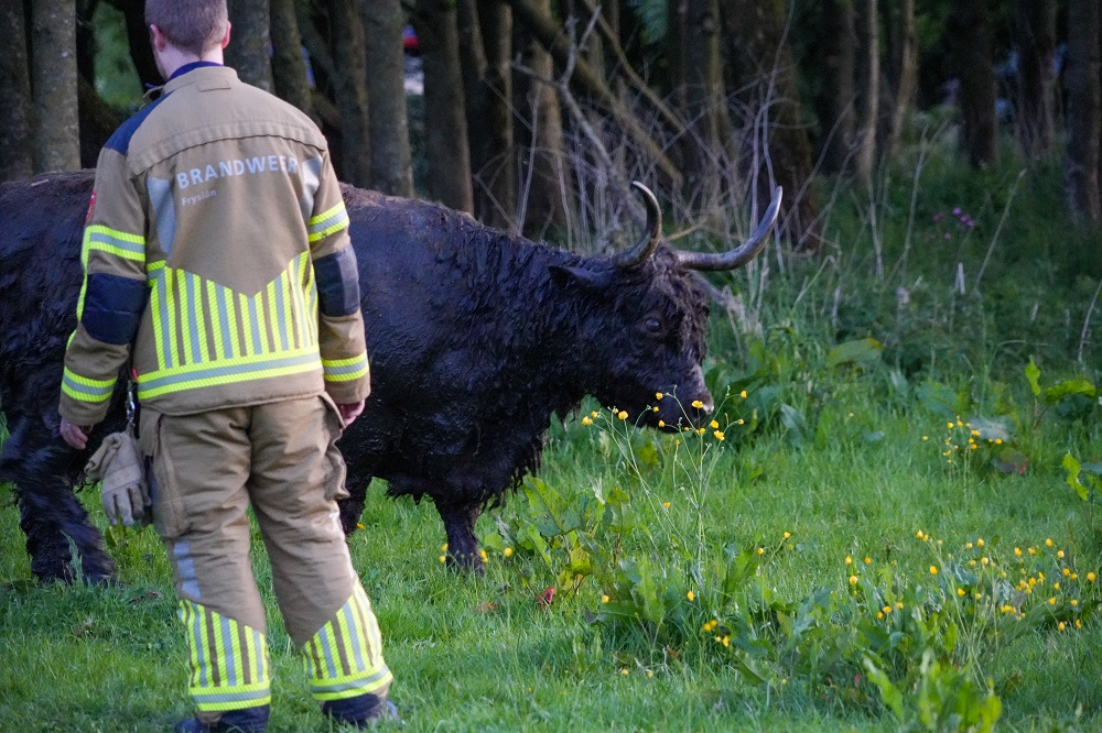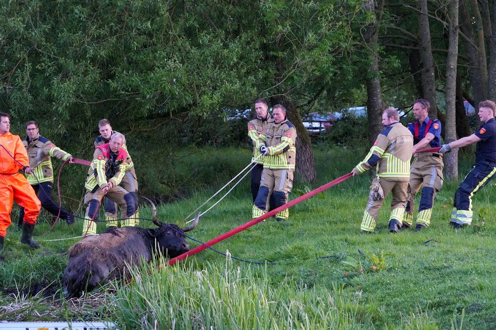 Het bleek te gaan om een Schotse Hooglander die in een sloot was beland en er niet meer zelfstandig uit kon komen. Twee vrouwen zagen het dier en sloegen alarm.