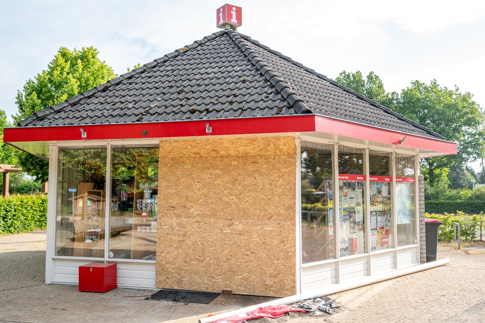 Man rijdt met auto informatiepunt en toeristenwinkel binnen