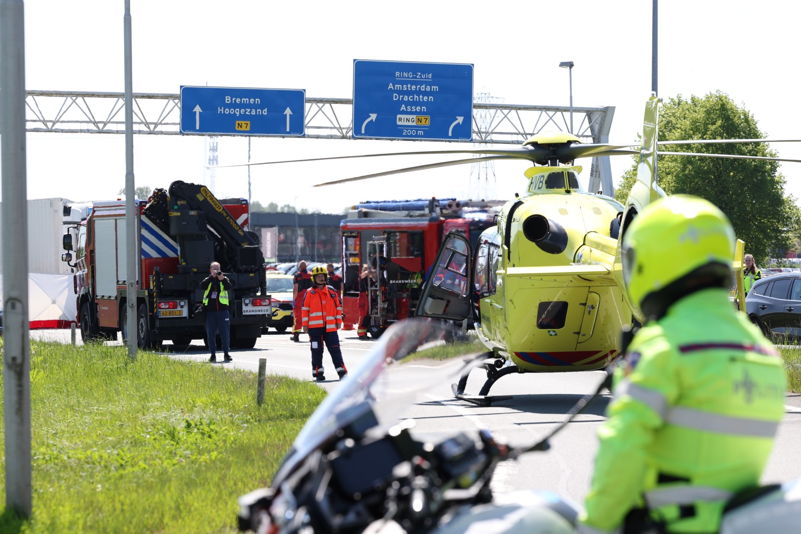 Werkbusje rijd achterop vrachtwagen, traumahelikopter ter plaatse