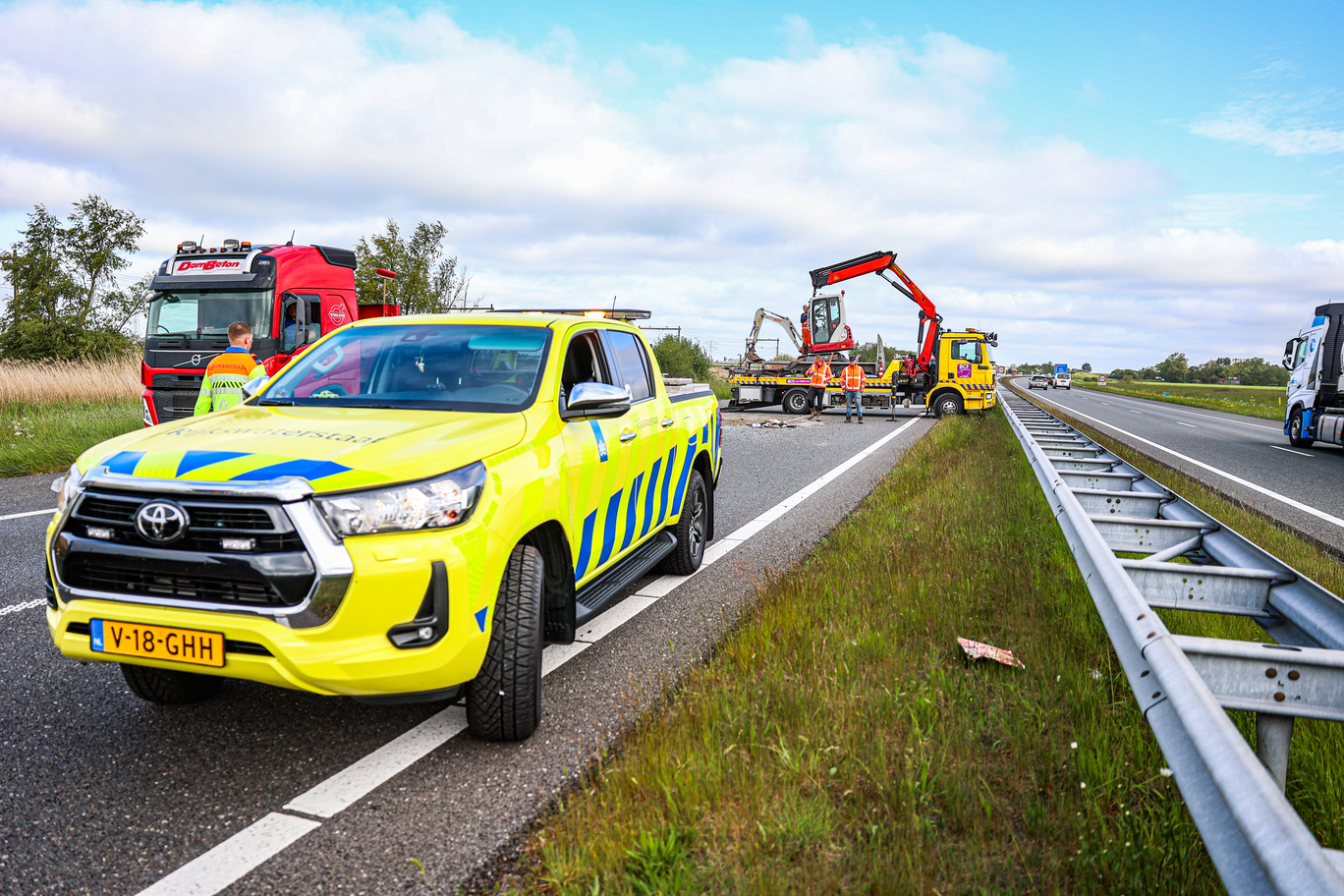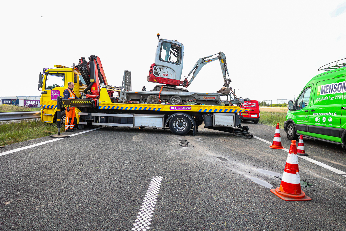 Een bestelbus met aanhanger raakte in de berm, waarna de bestuurder probeerde te corrigeren. Daarbij kantelde de aanhanger, die was beladen met een graafmachine. Het incident leidde tot een tijdelijke volledige afsluiting van de snelweg. Nadat de vluchtstrook was vrijgemaakt, kon het verkeer via die route passeren.