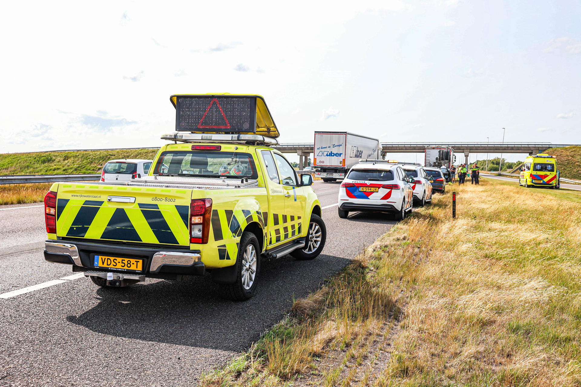 Politie, ambulance en Rijkswaterstaat kwamen ter plaatse. In de personenauto zaten onder anderen twee jonge kinderen. Alle betrokkenen worden ter plaatse gecontroleerd door ambulancepersoneel.