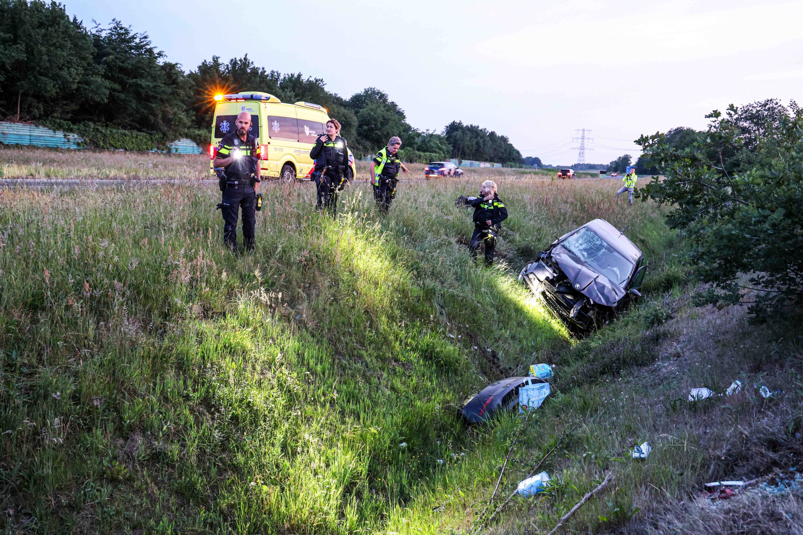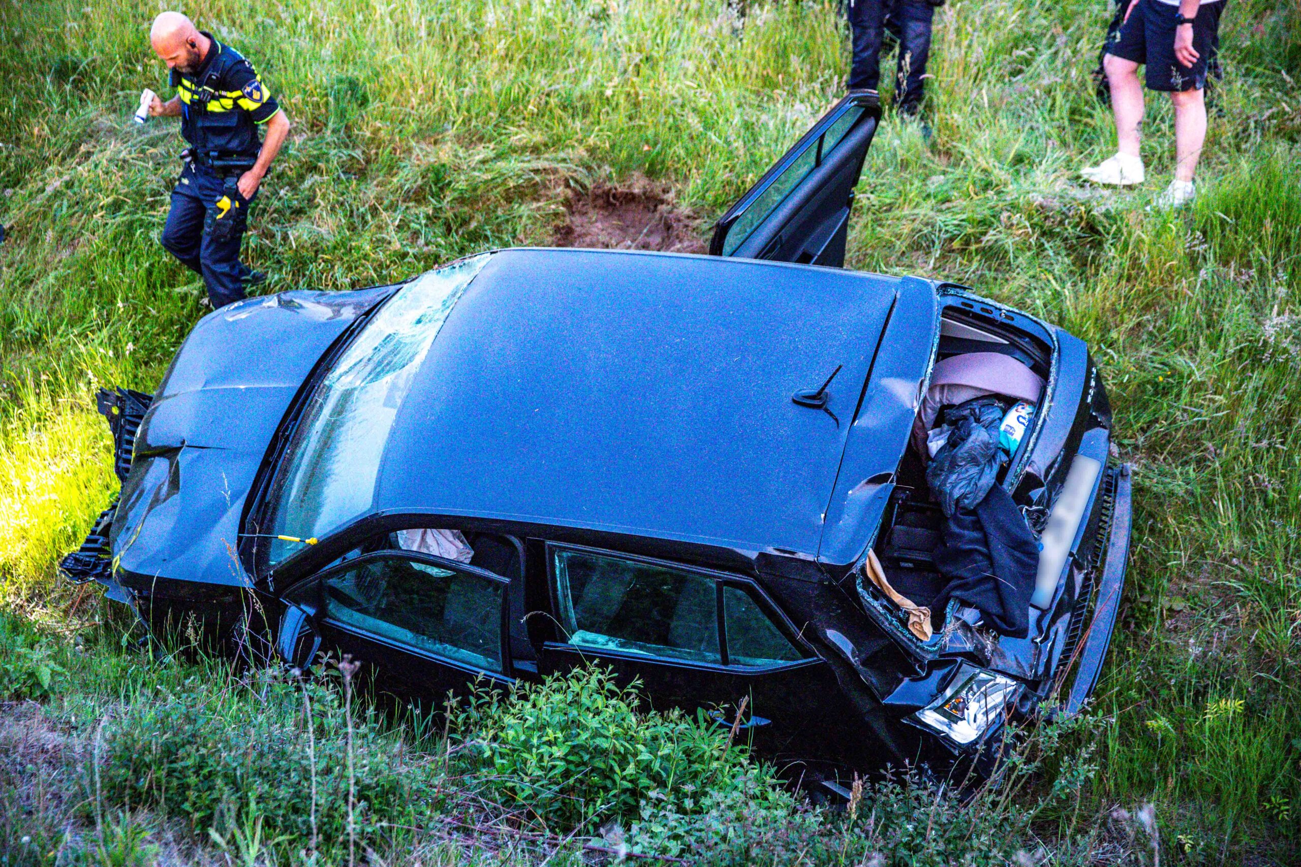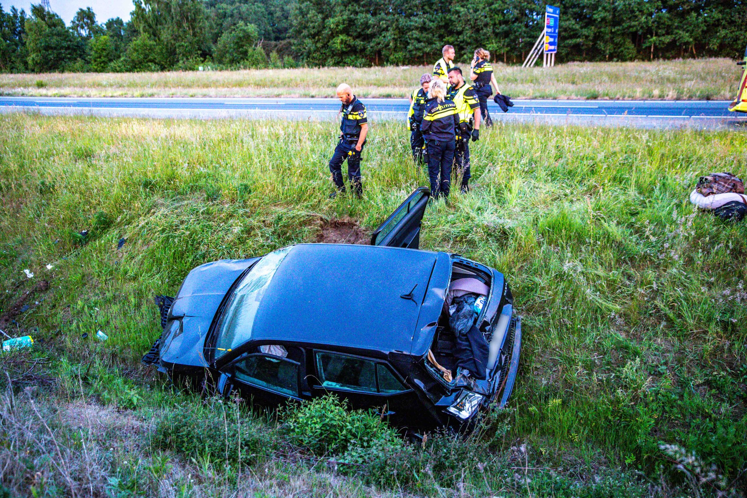 Auto raakt van de snelweg en belandt in greppel, drie personen naar ziekenhuis