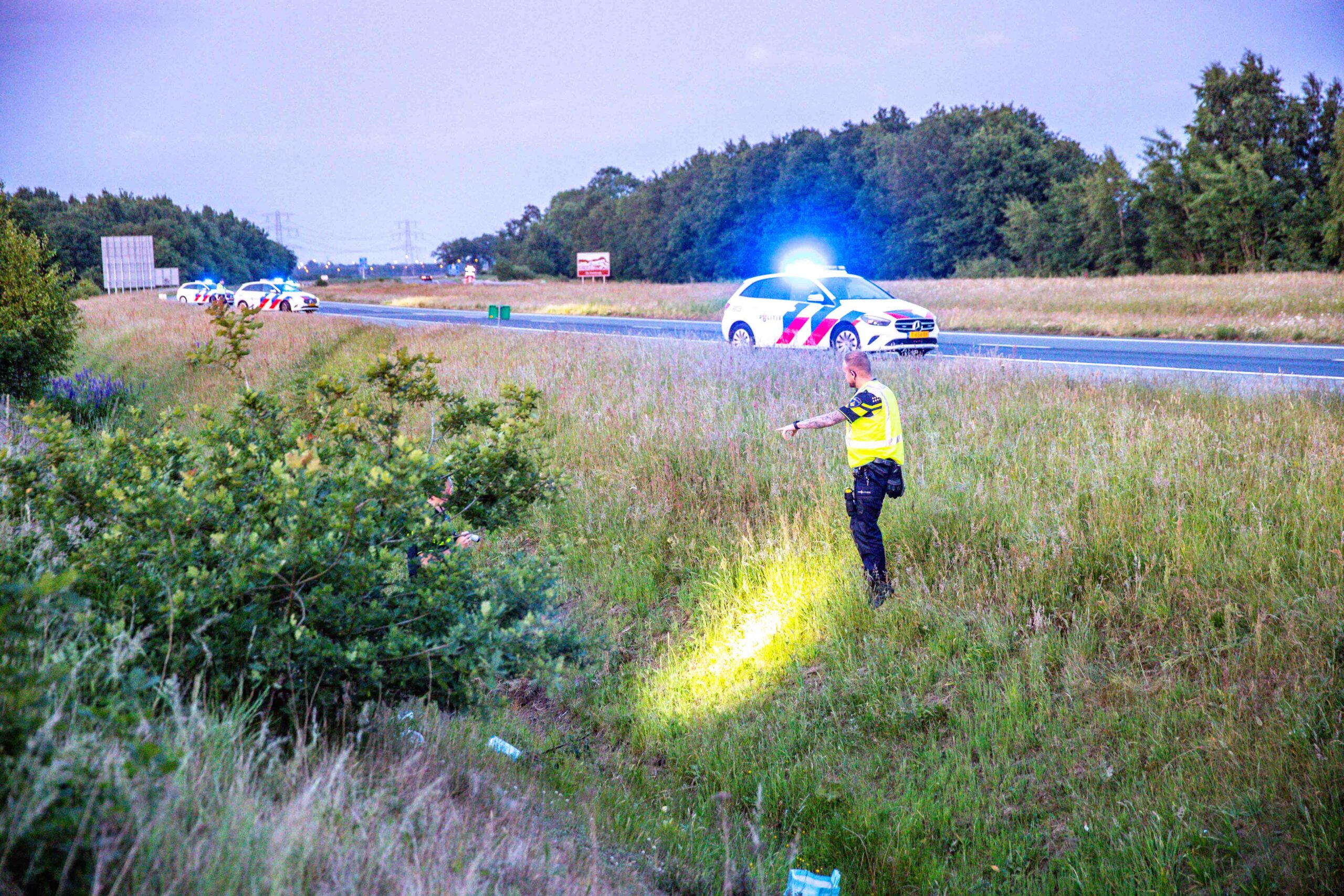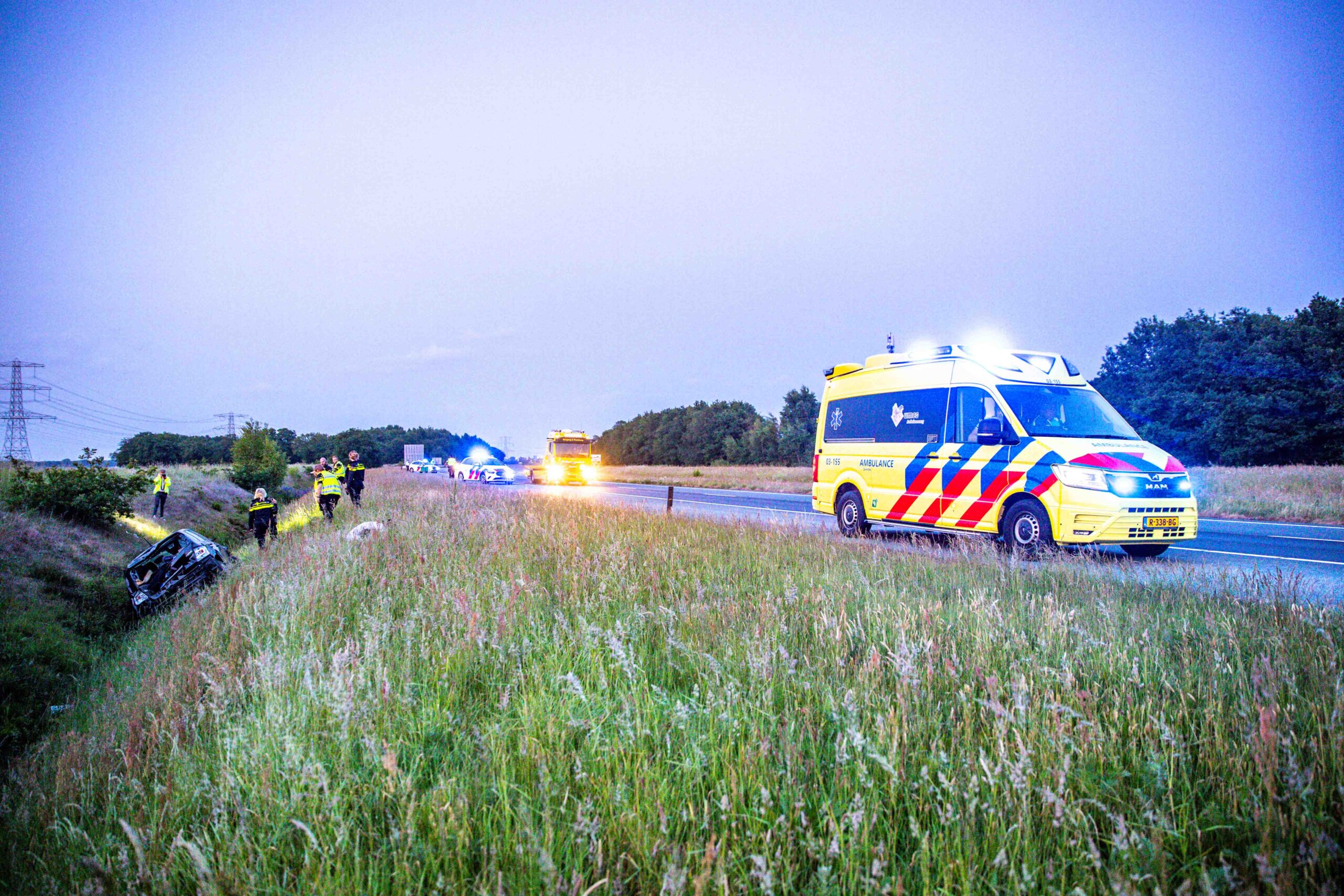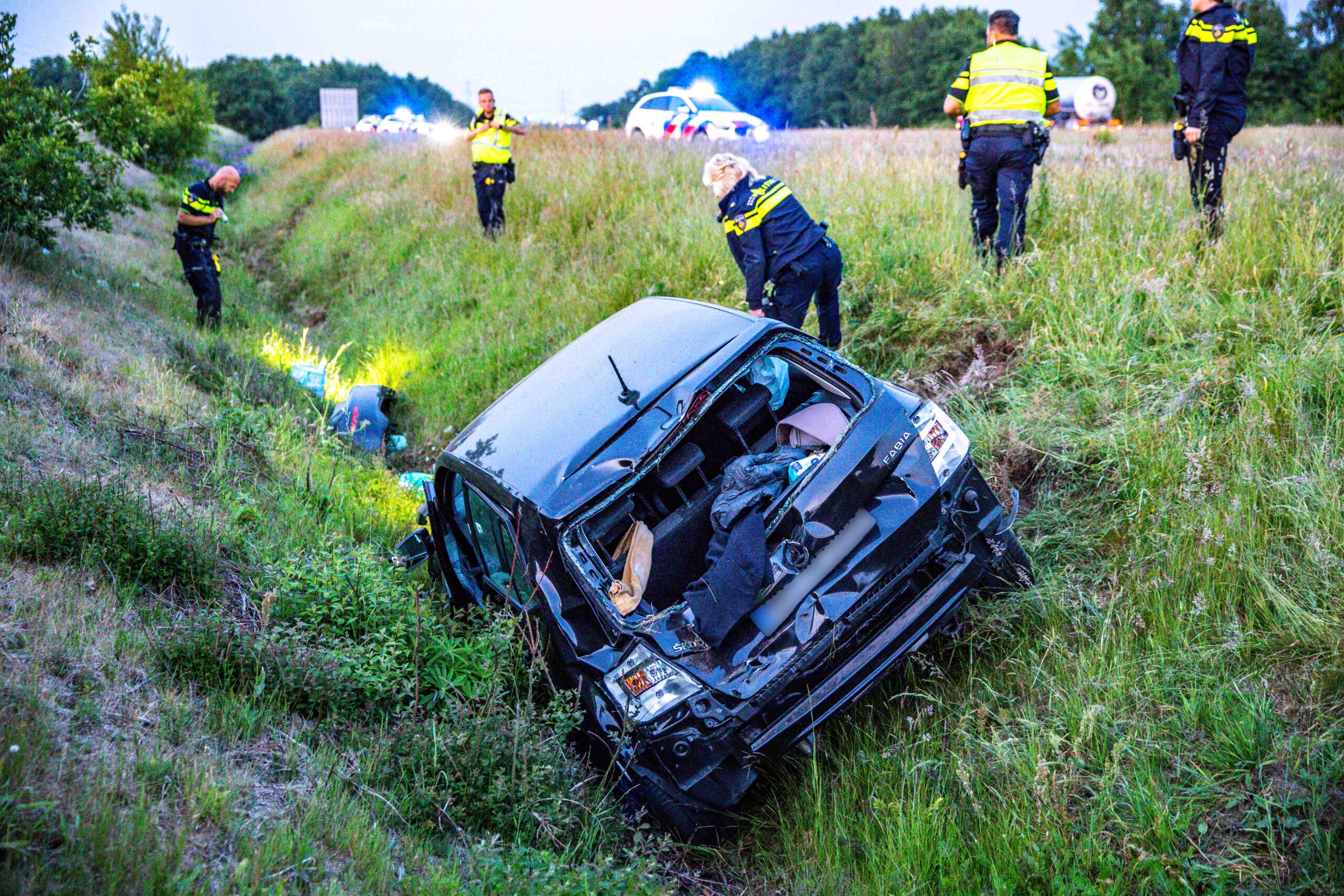Auto raakt van de snelweg en belandt in greppel, drie personen naar ziekenhuis