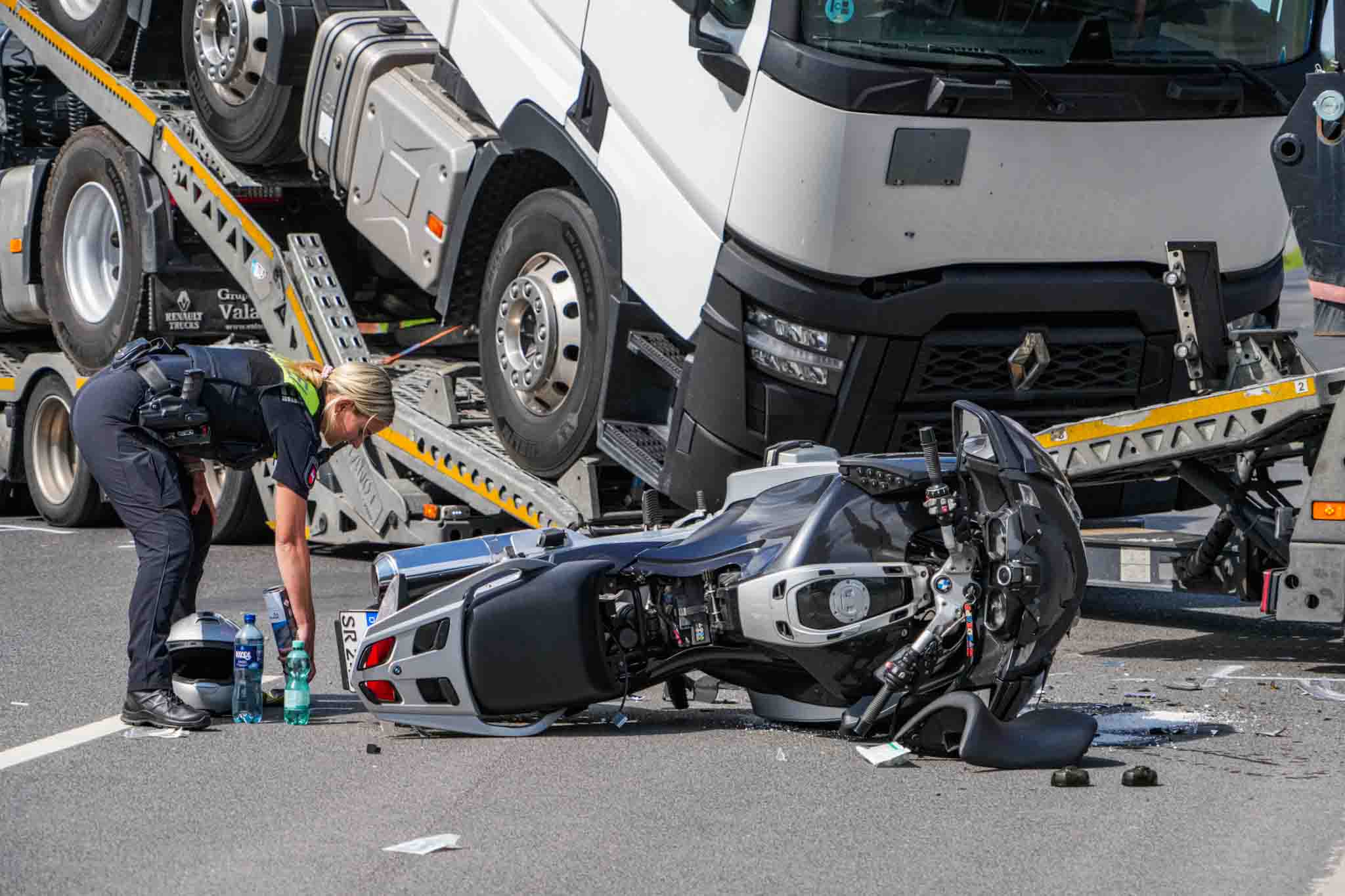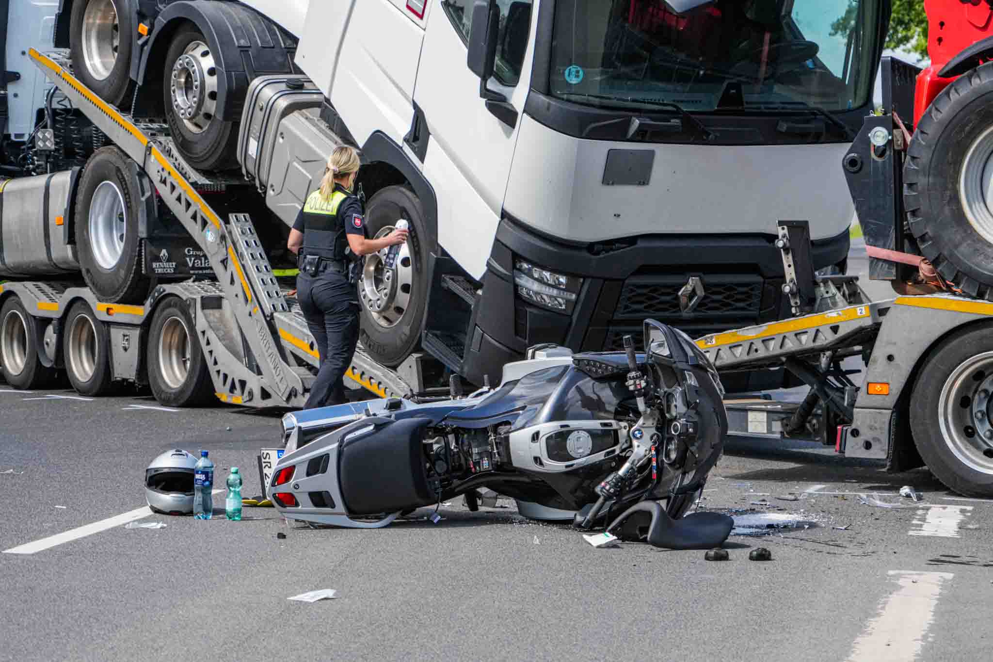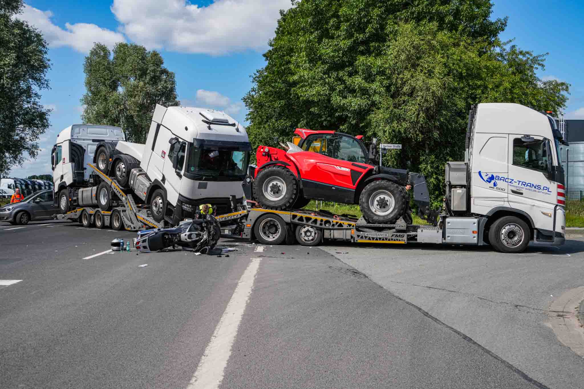 Een Poolse vrachtwagenchauffeur zag bij het afslaan vermoedelijk een Duitse motorrijder over het hoofd, waarna een harde botsing volgde. De motorrijder raakte zwaargewond en is per ambulance overgebracht naar het ziekenhuis.