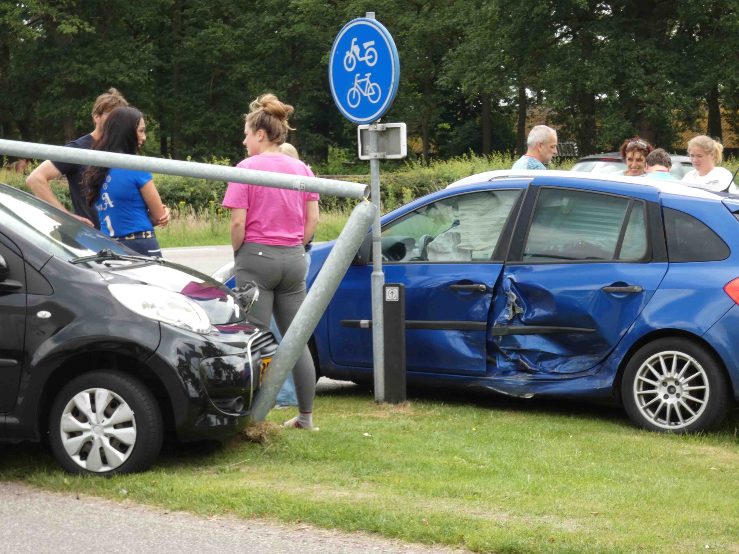 Twee auto’s botsen op kruising, lantaarnpaal omver gereden