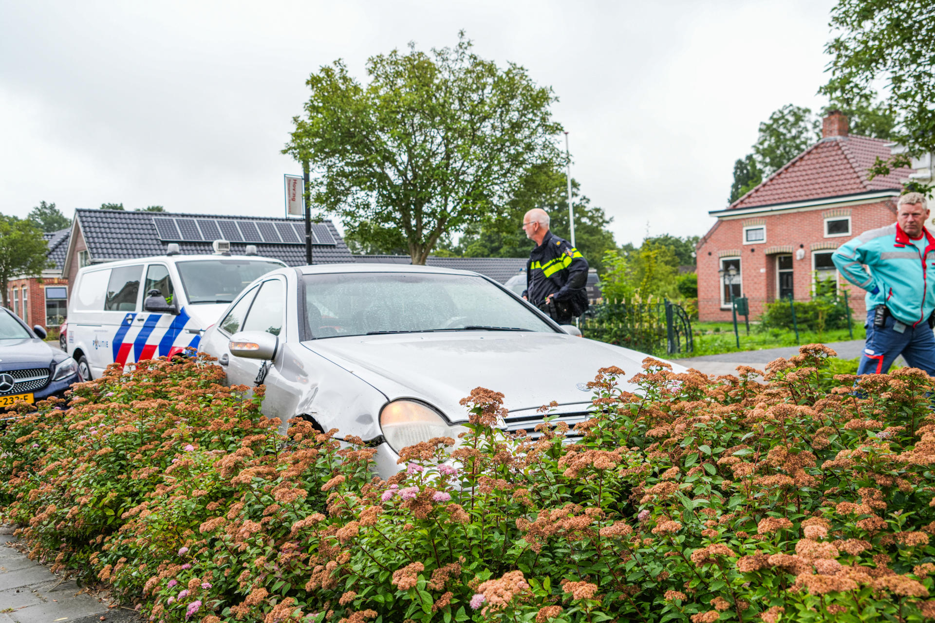 De bestuurder wordt gecontroleerd door het ambulancepersoneel. Het verkeer op de Hoofdstraat kan om en om passeren. De toedracht van het ongeval wordt onderzocht.
