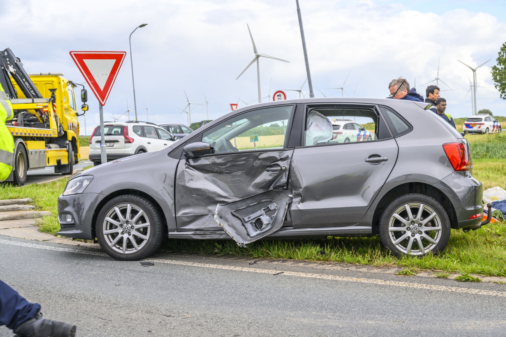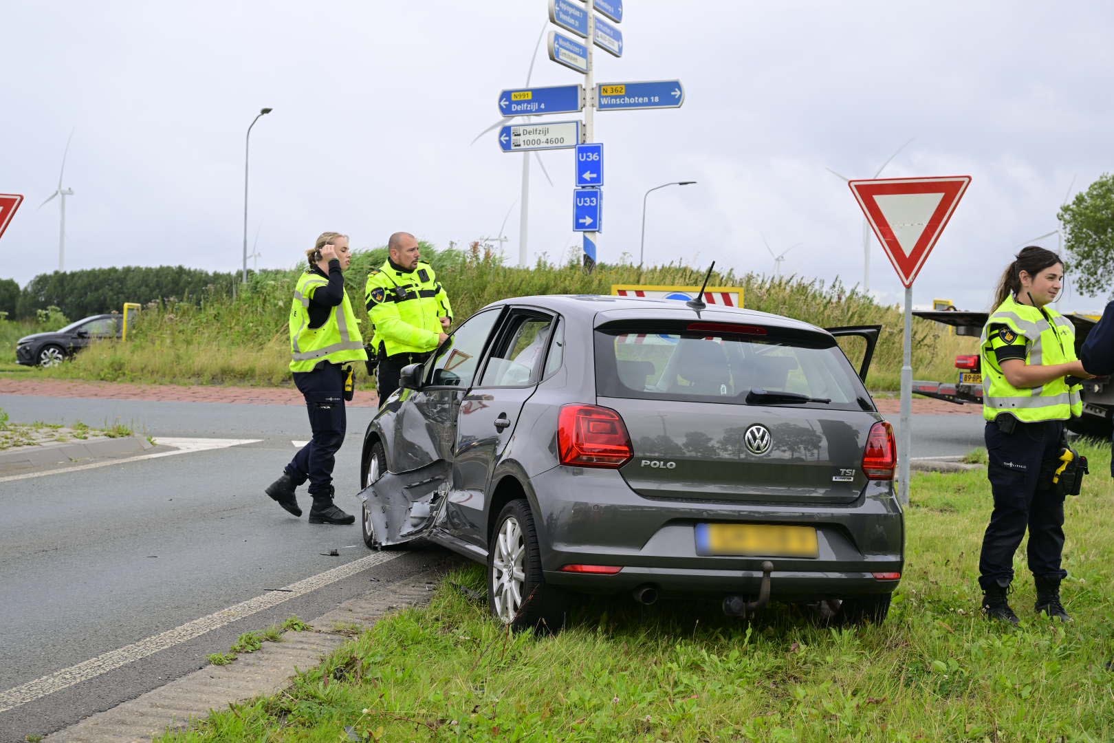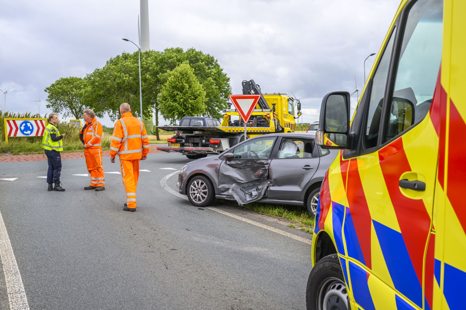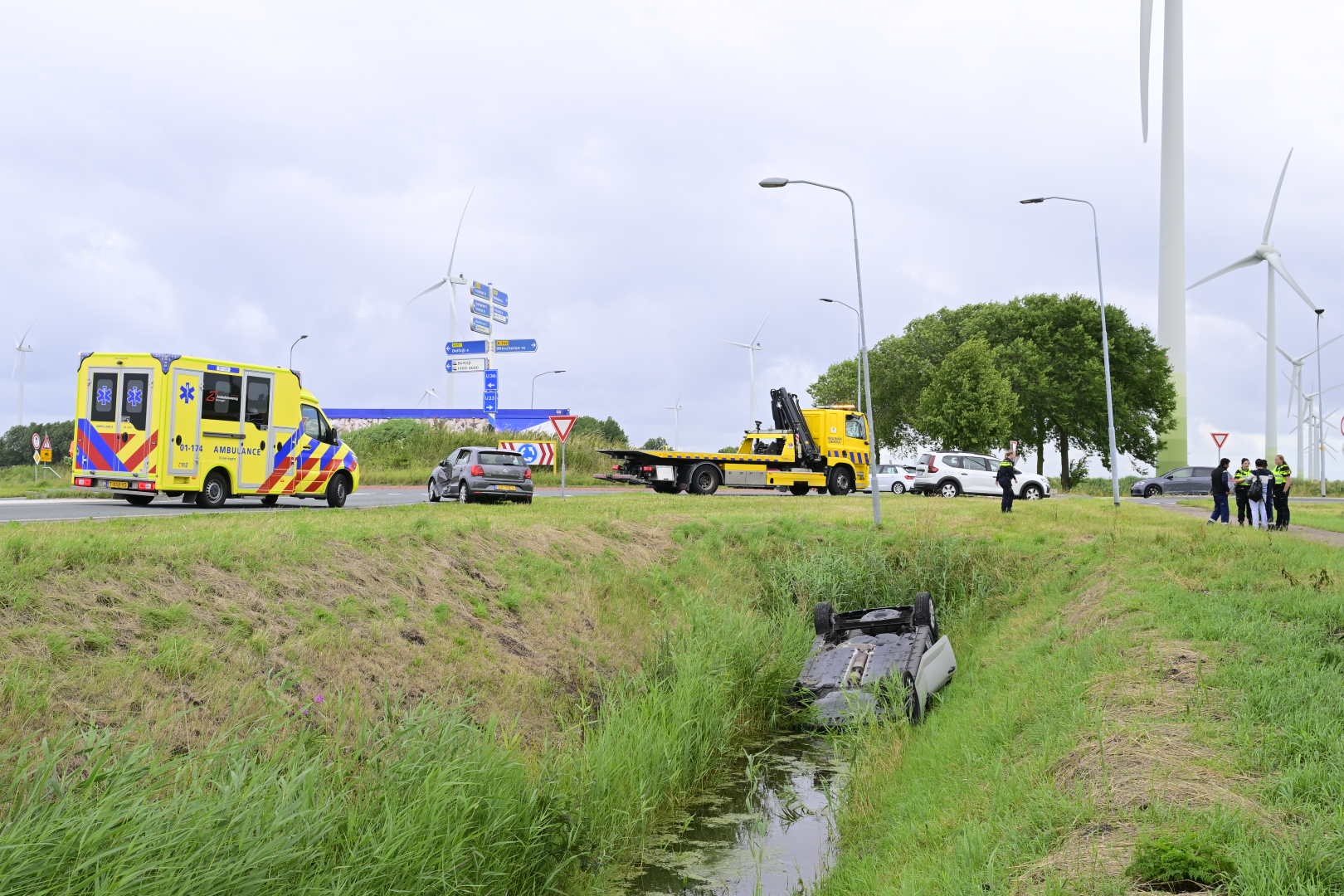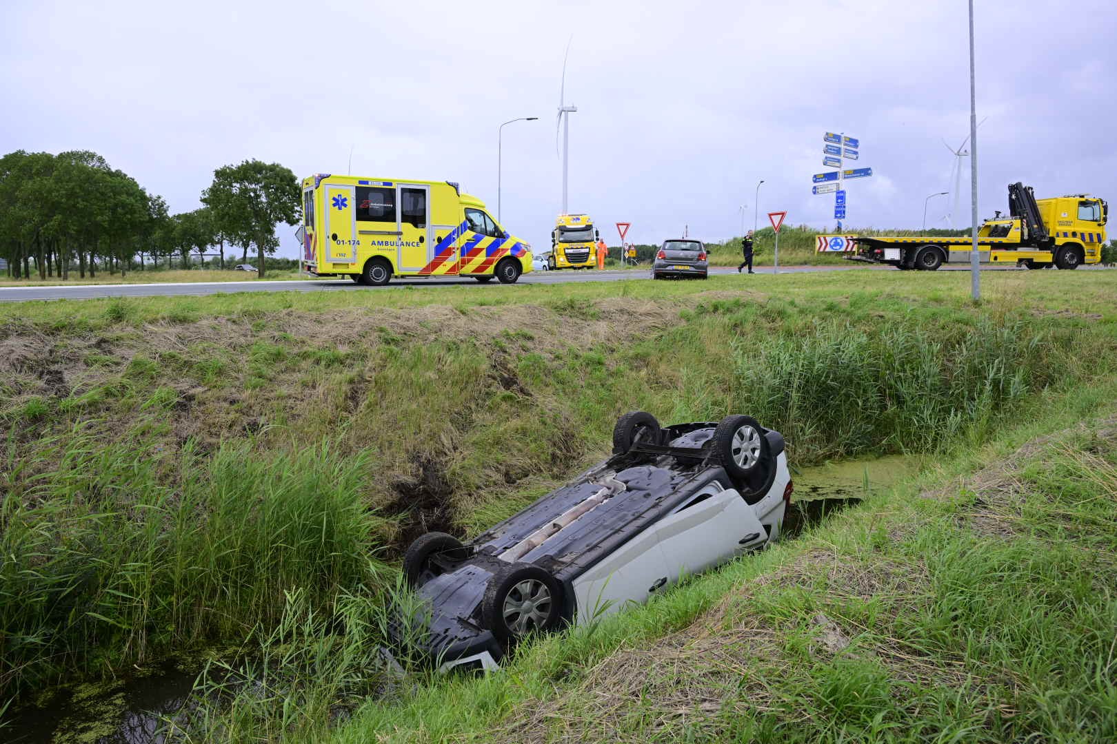De bestuurder van een witte Dacia verloor op de rotonde de controle over het voertuig, schoot over de middengeleider en botste tegen de zijkant van een grijze Volkswagen. De Dacia kwam vervolgens ondersteboven in een sloot terecht. Beide inzittenden konden ongedeerd uit de auto komen.