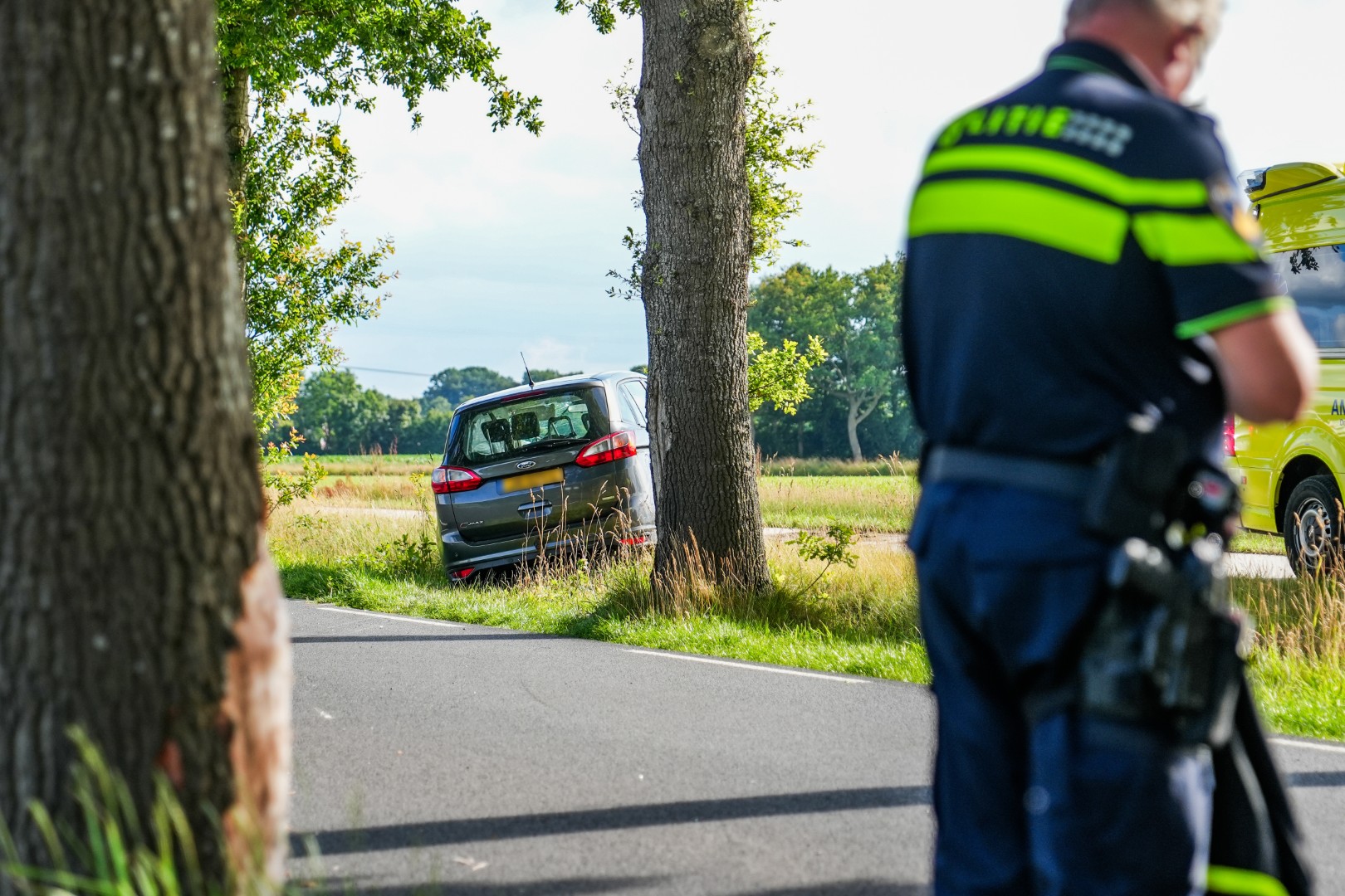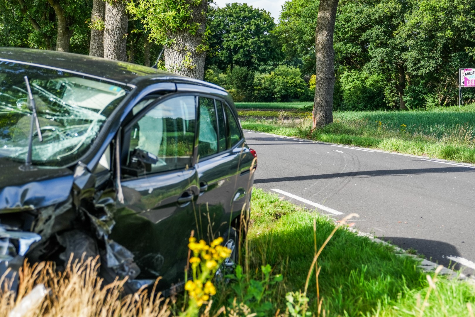 Een automobiliste raakte door nog onbekende oorzaak van de weg, schampte een boom en kwam tot stilstand op een verhoogd gedeelte naast het fietspad. De auto raakte daarbij flink beschadigd.