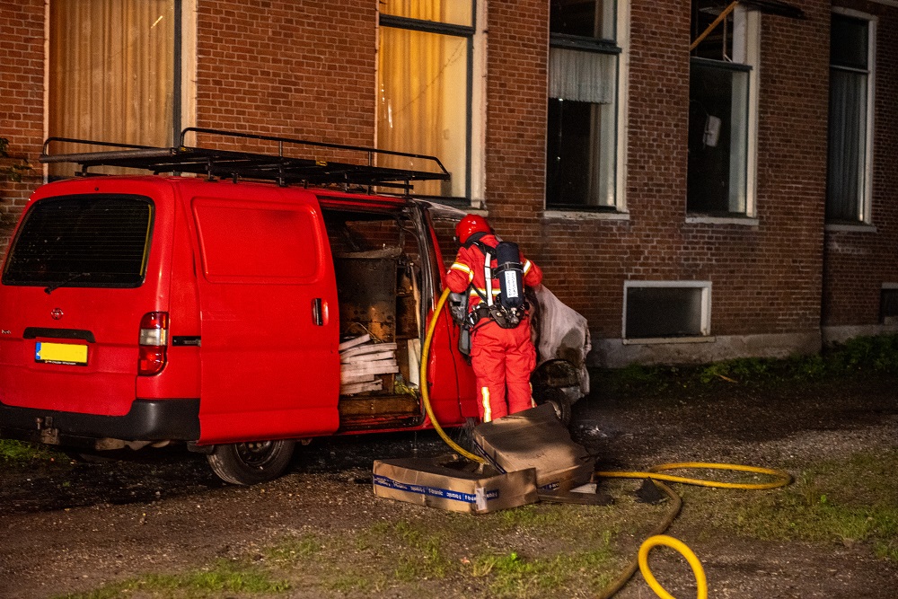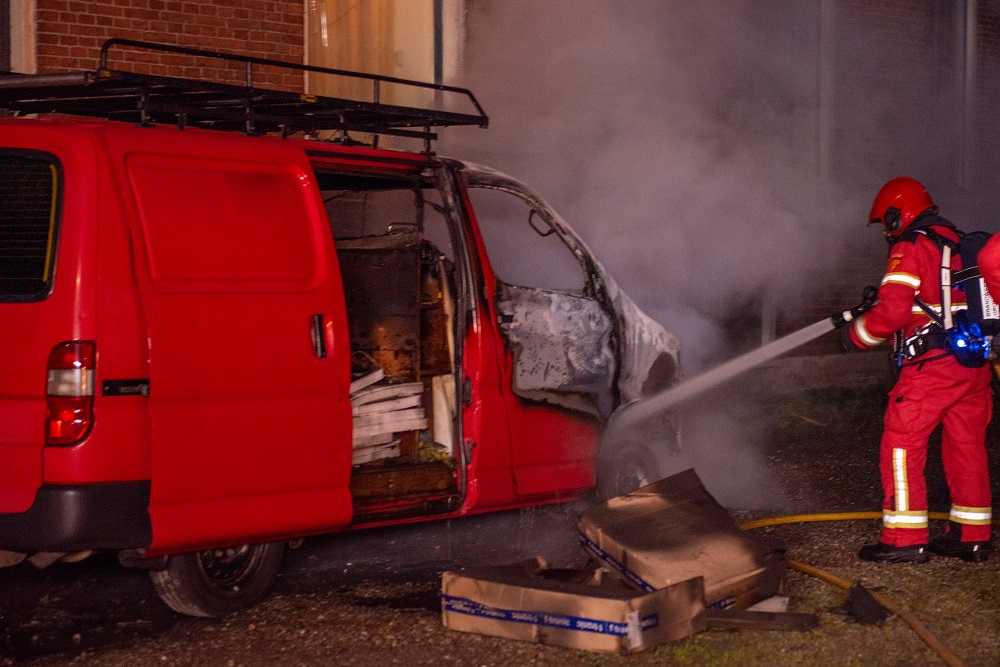 De voorzijde van de auto raakte zwaar beschadigd. De politie heeft de omgeving afgezet en onderzoekt de oorzaak van de brand.