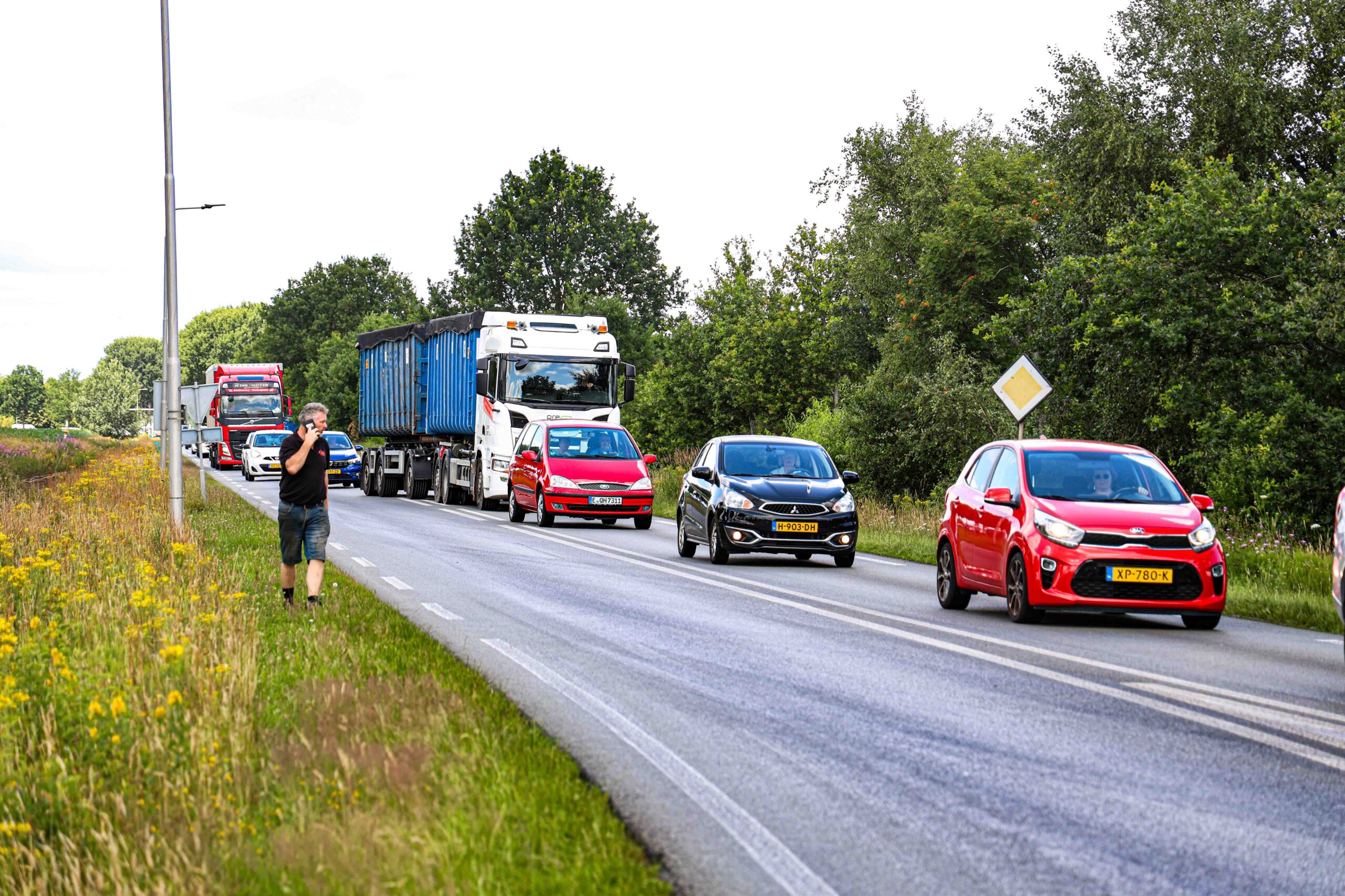 Het landbouwvoertuig kwam met pech stil te staan en bleek tientallen meters lang een onbekende vloeistof te lekken. Hierdoor ontstond een gevaarlijke verkeerssituatie: auto’s moesten noodgedwongen via de tegengestelde rijrichting om de trekker heen te rijden.