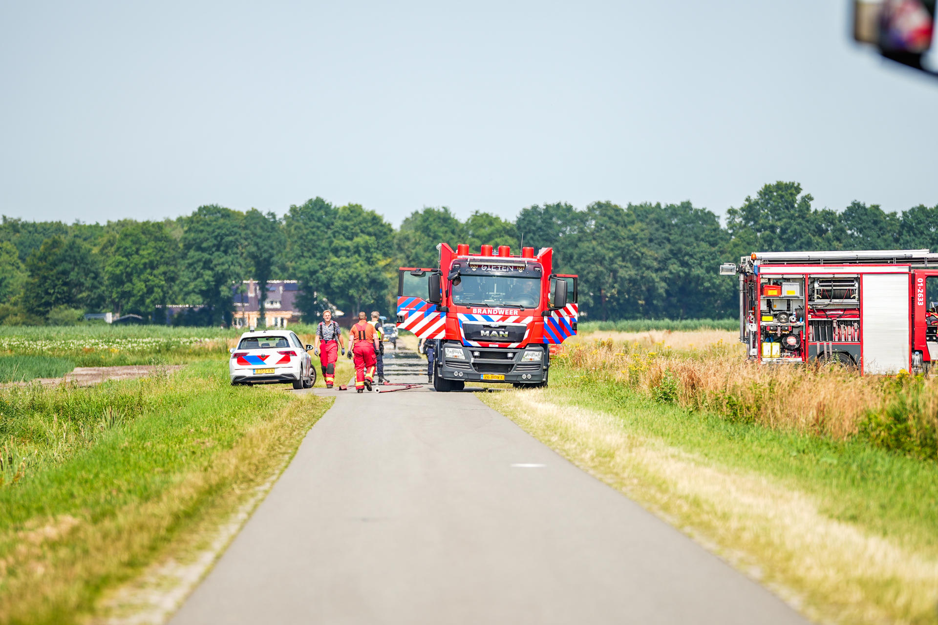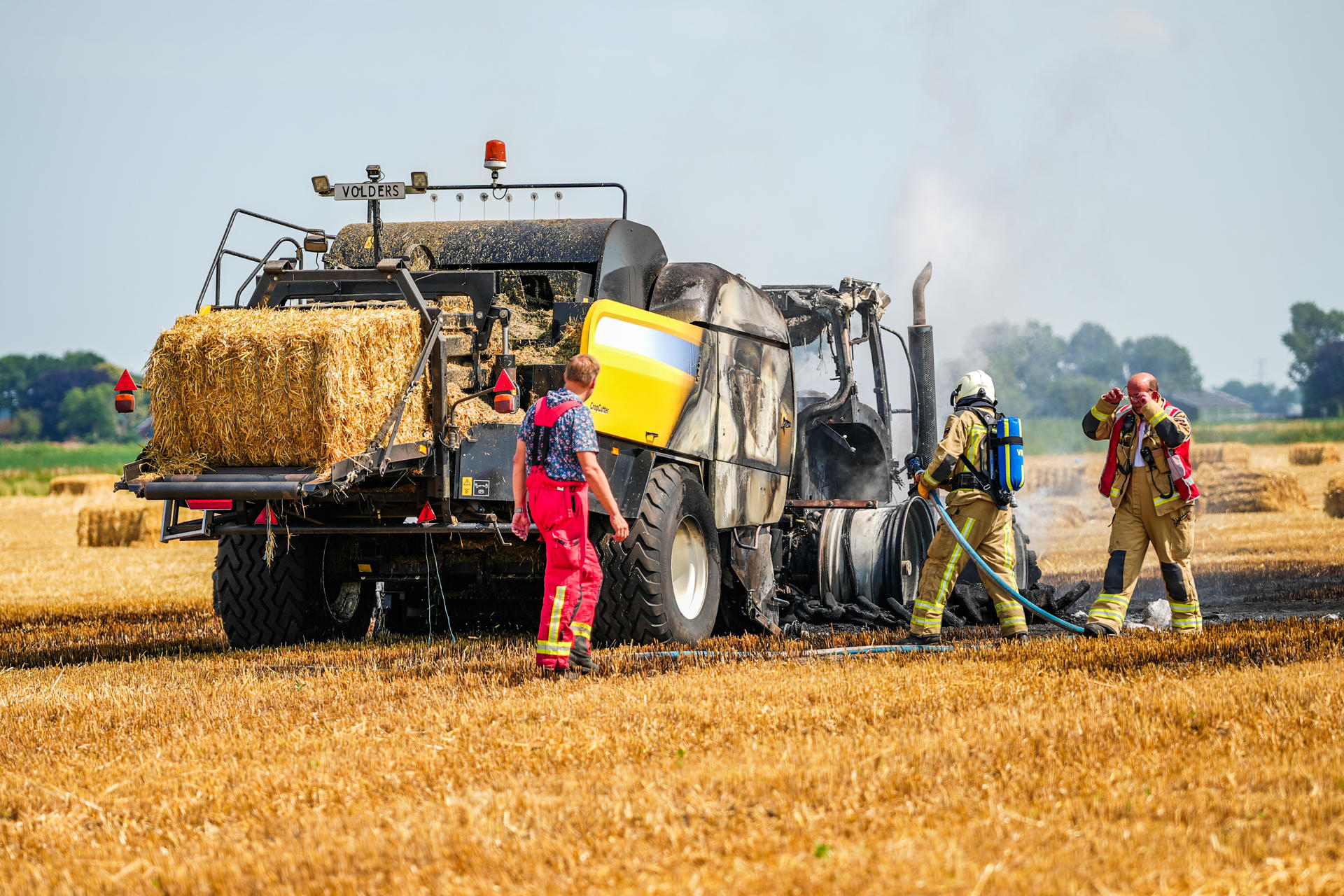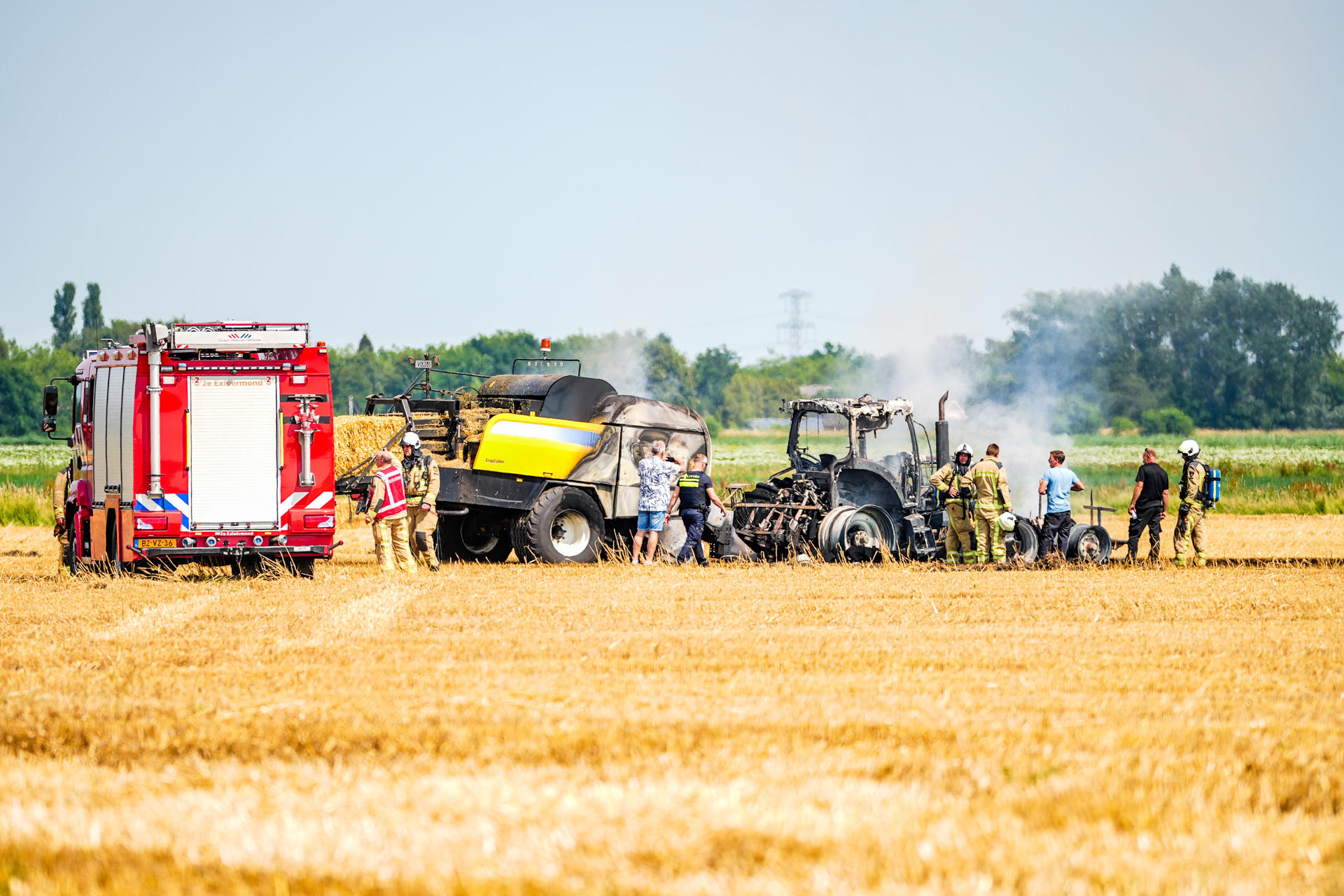 Bij aankomst van de brandweer stonden de trekker en een deel van de balenpers al volledig in brand. Ook meerdere hooibalen vlogen in brand en liggen nog te smeulen op het weiland. De brandweer haalt de hooibalen uit elkaar om ze volledig te kunnen blussen. Het vuur sloeg ook over naar het grasland waar de boer op dat moment aan het werk was. De dikke, zwarte rookwolken waren tot kilometers in de omtrek te zien.