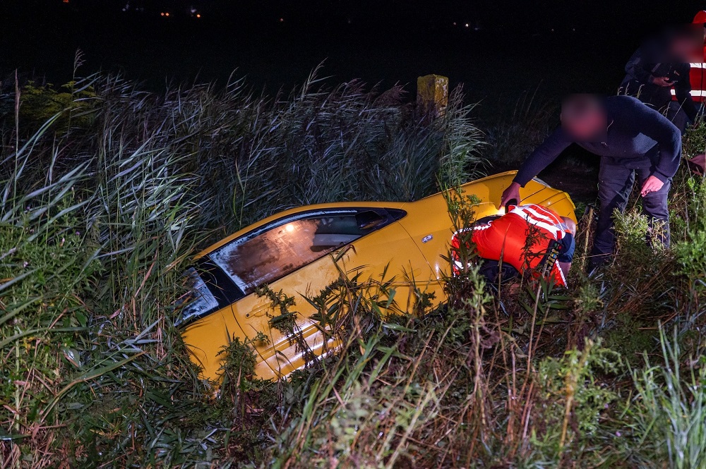 De auto was vermoedelijk in een bocht van de weg geraakt. De bestuurder bleek niet bekneld en raakte niet gewond, waarop de brandweer kon terugkeren.