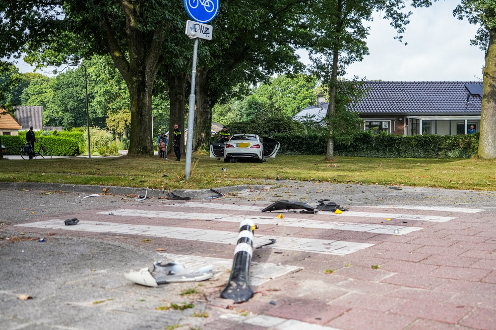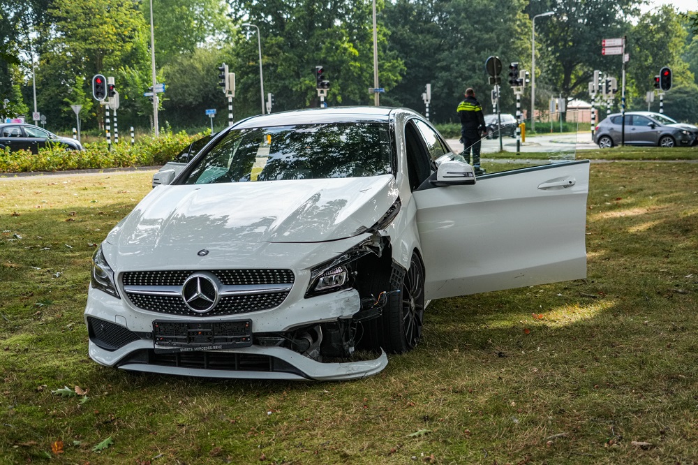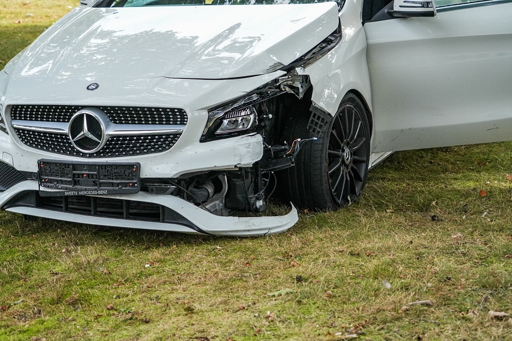 Een Mercedes raakte van de weg, reed een paaltje met een voetgangerslicht omver en kwam uiteindelijk tot stilstand op een grasveldje.