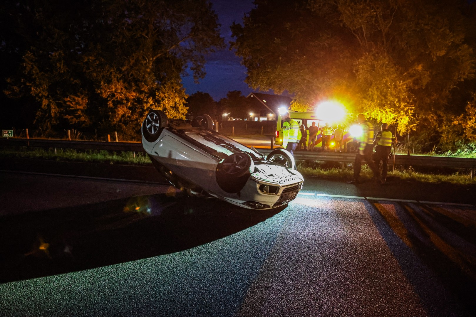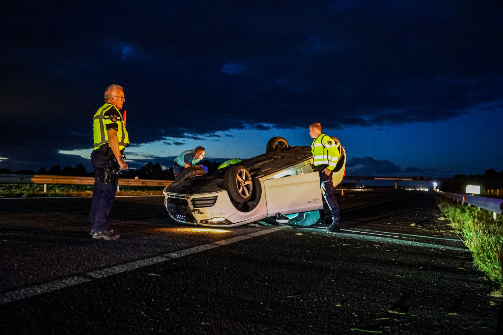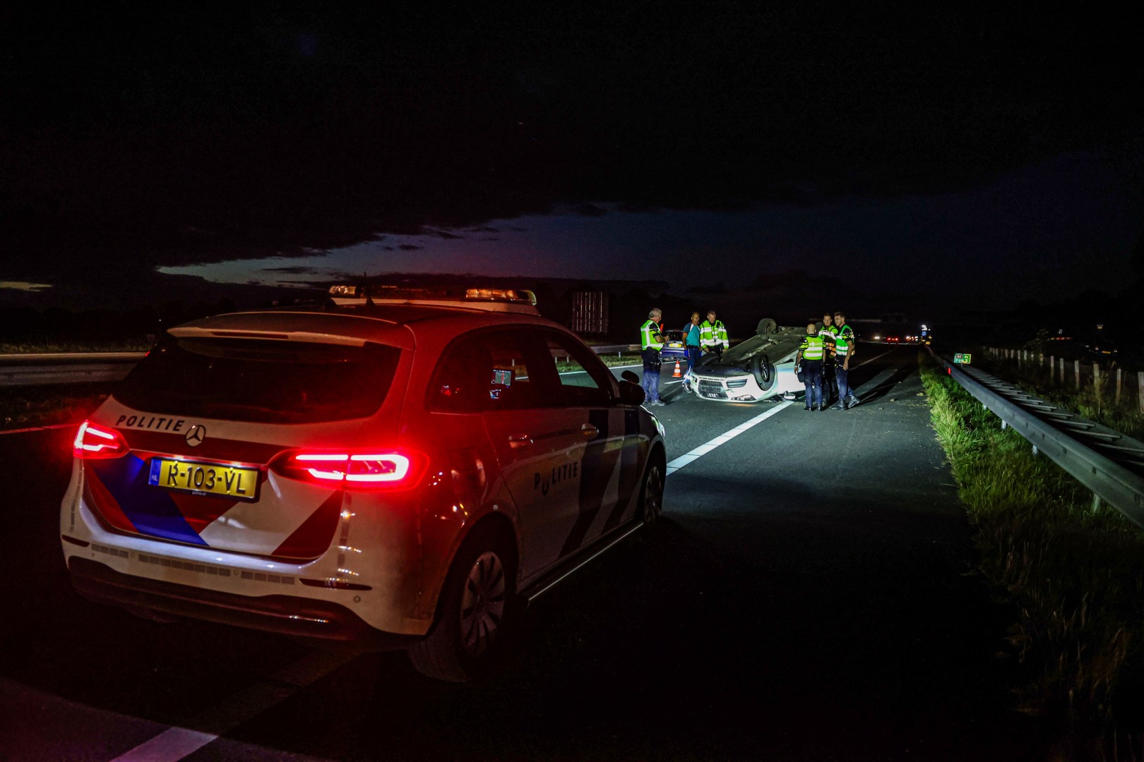 Een auto raakte daar door nog onbekende oorzaak de linker vangrail, sloeg over de kop en kwam ondersteboven tot stilstand op de rechterrijbaan en vluchtstrook. In het voertuig zat één inzittende, die ter plaatse is behandeld door ambulancepersoneel en daarna naar het ziekenhuis is vervoerd.