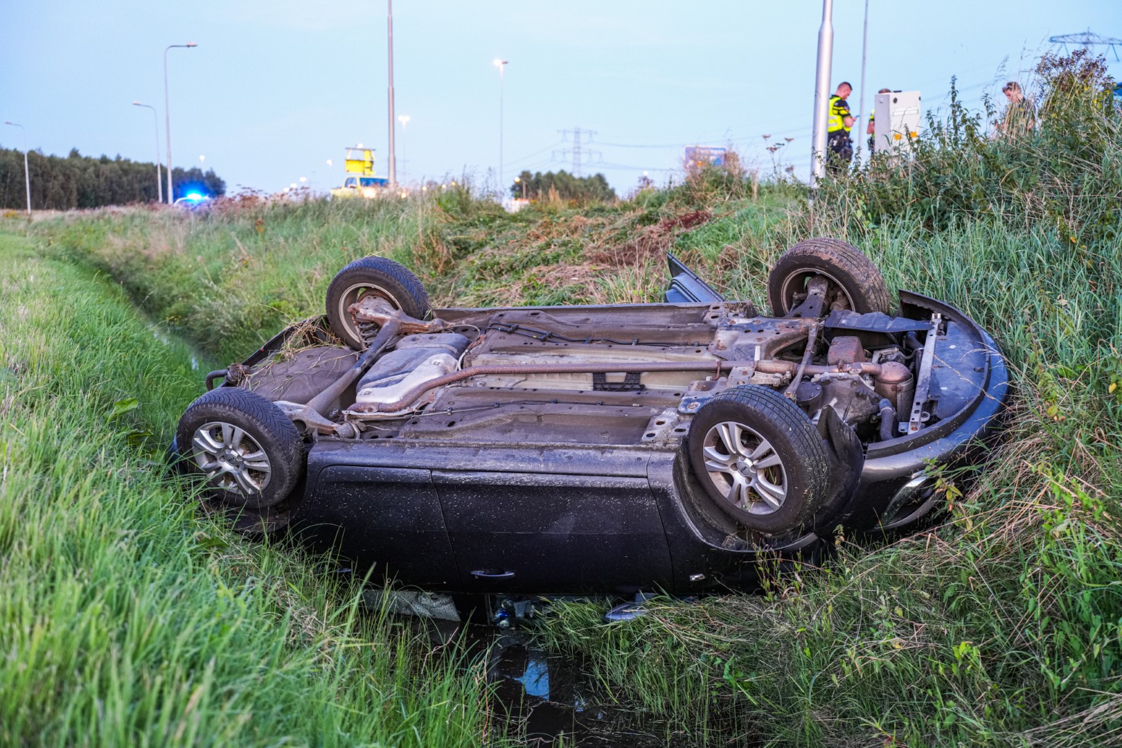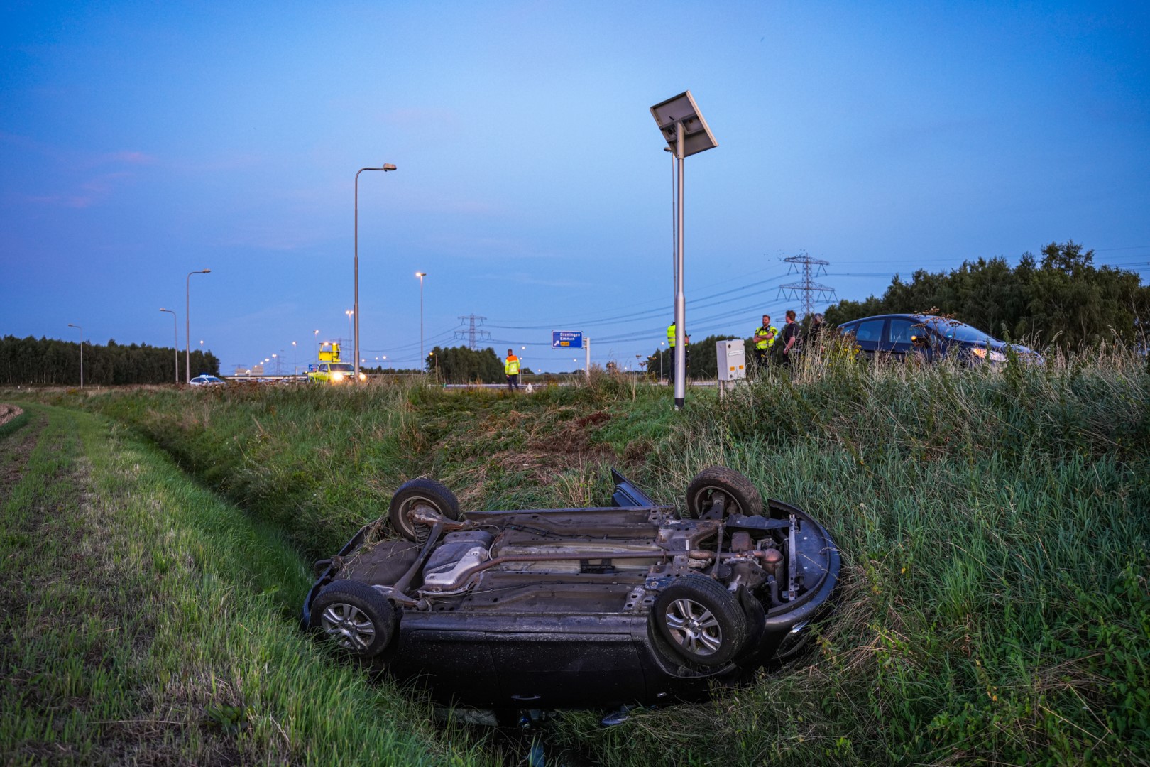 Op de oprit komende vanaf de N34 naar de A37 richting Hoogeveen raakte een personenauto van de weg en belandde op de kop in een naastgelegen sloot.