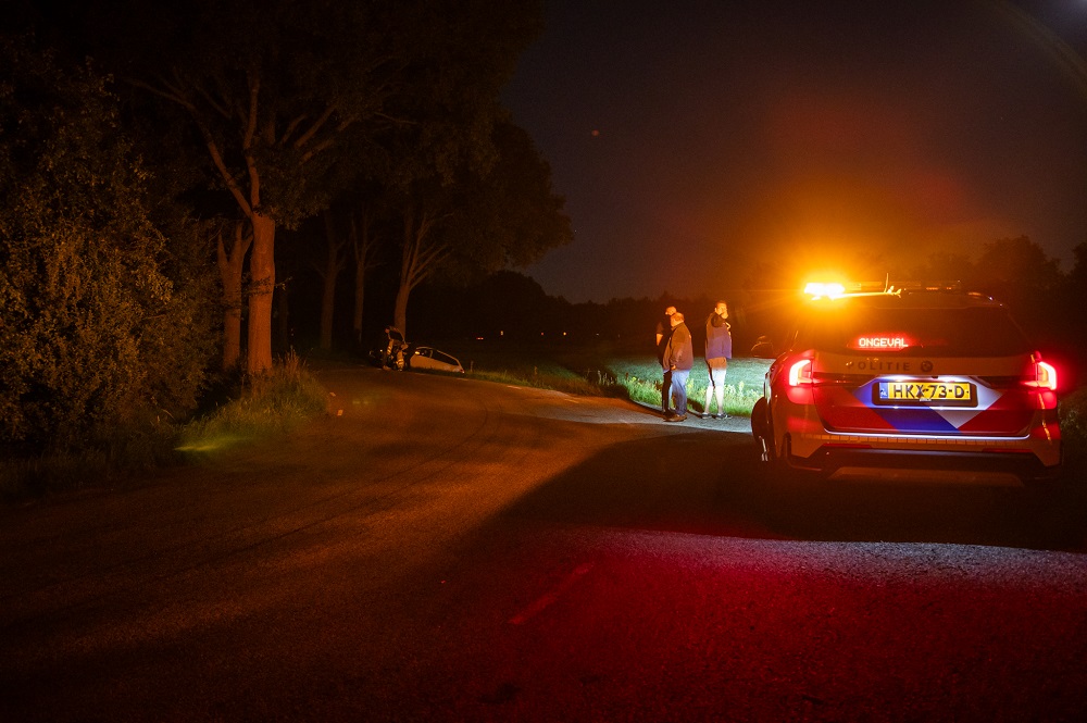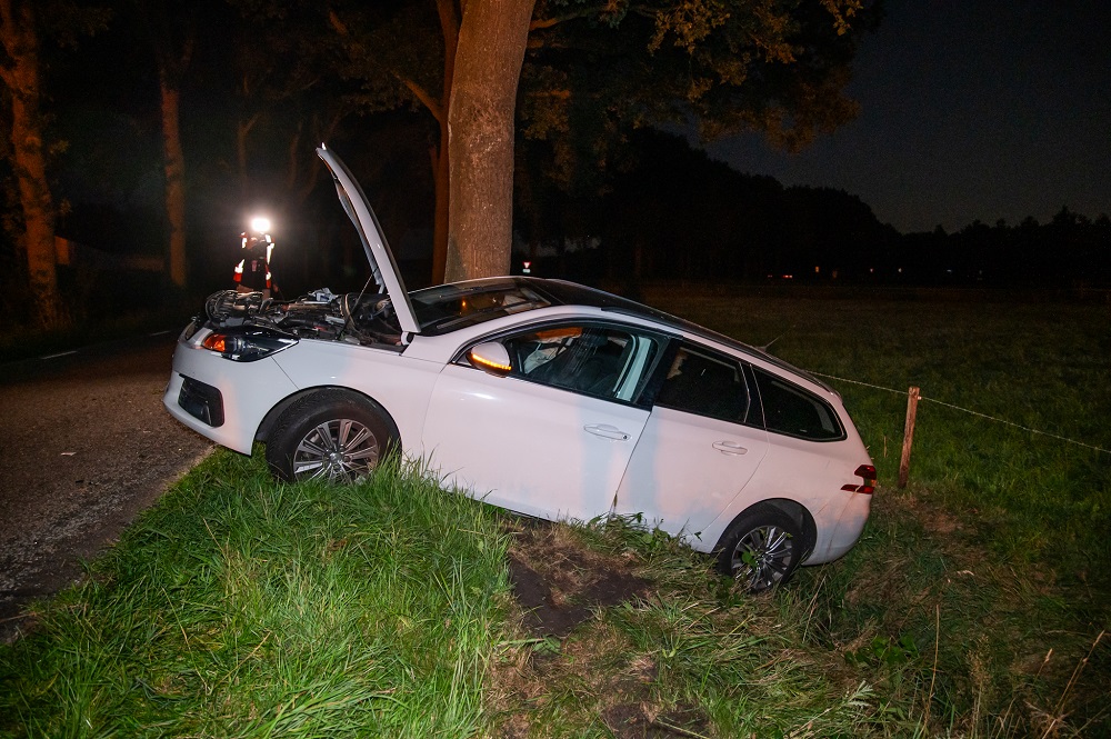 Het voertuig miste in een bocht de weg en raakte van de rijbaan. De inzittenden wisten zelf uit te stappen en bleven ongedeerd.