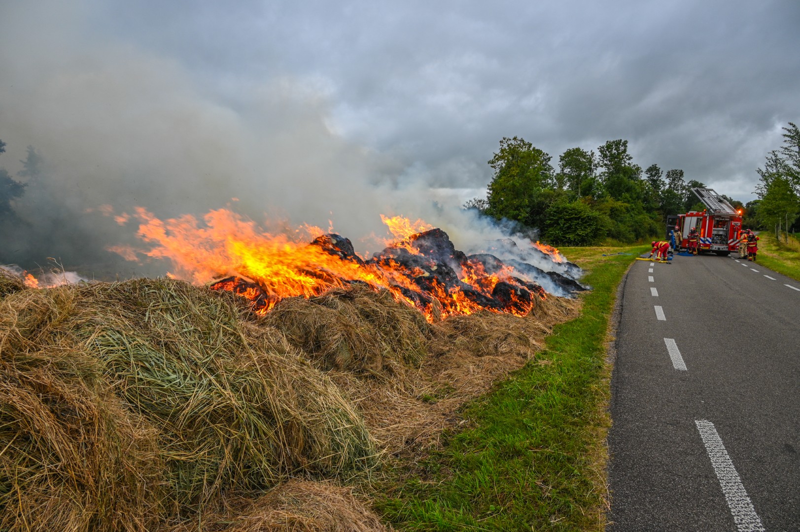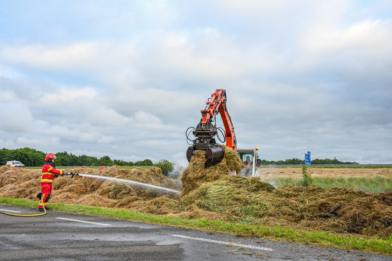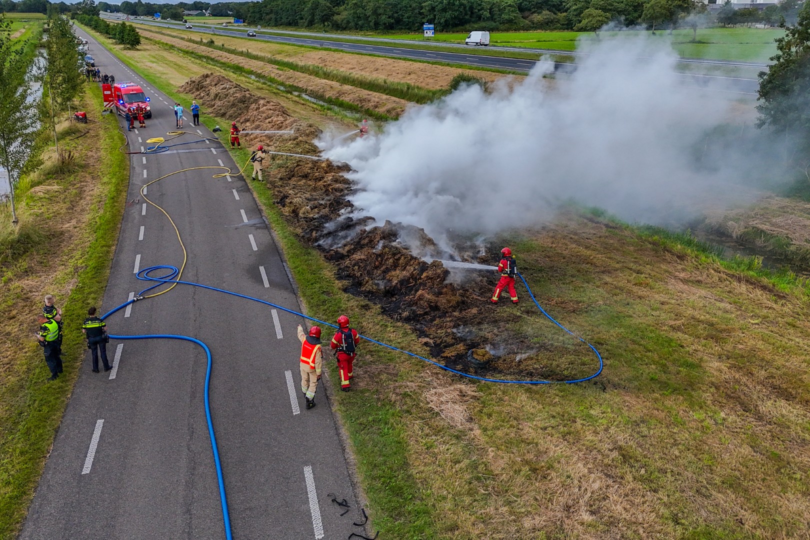 Een kraan werd ingezet om het hooi uit elkaar te trekken en een scheidingslijn te maken tussen het brandende en het nog niet brandende deel. De brand trok veel bekijks en de inzet van de brandweer duurde geruime tijd.