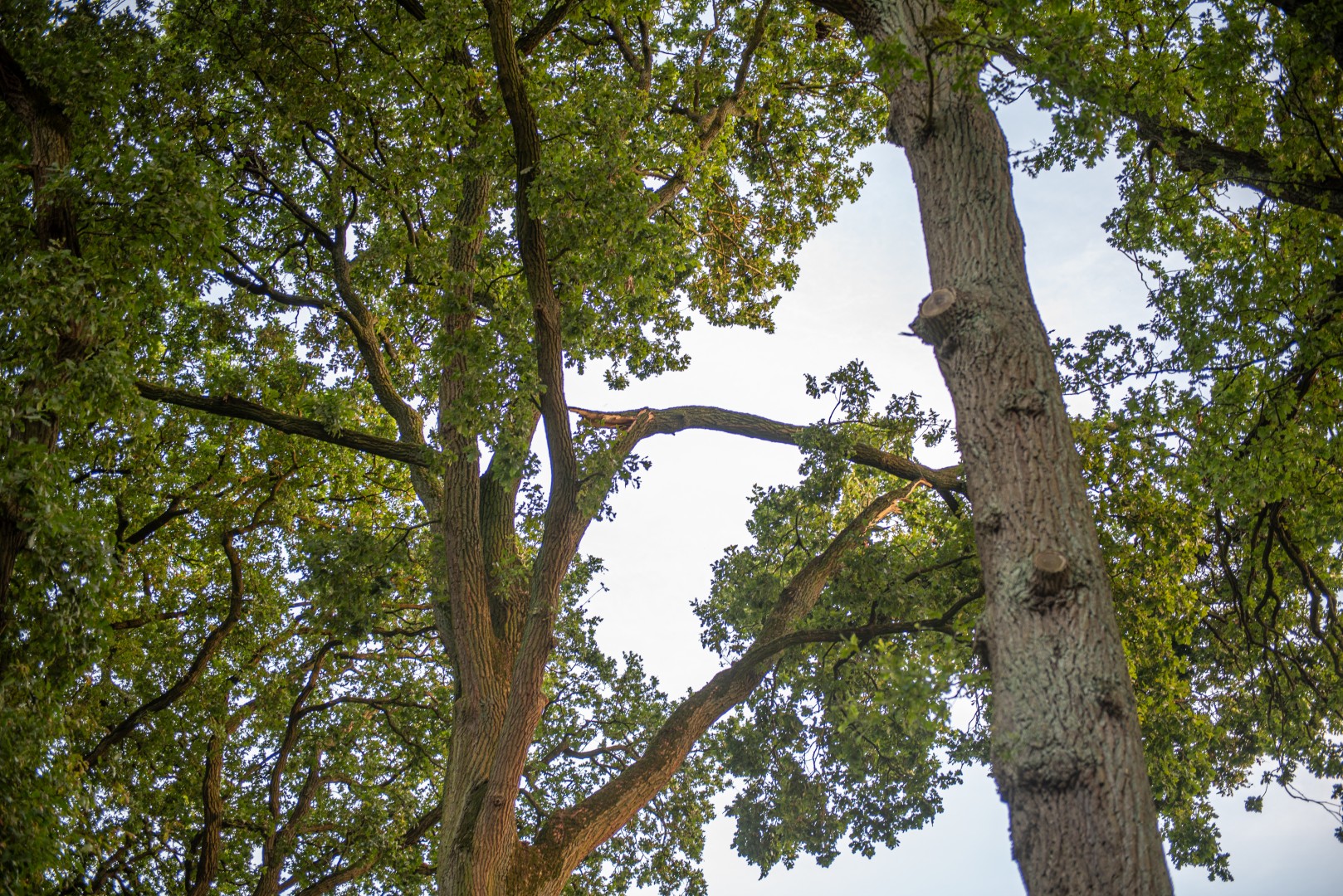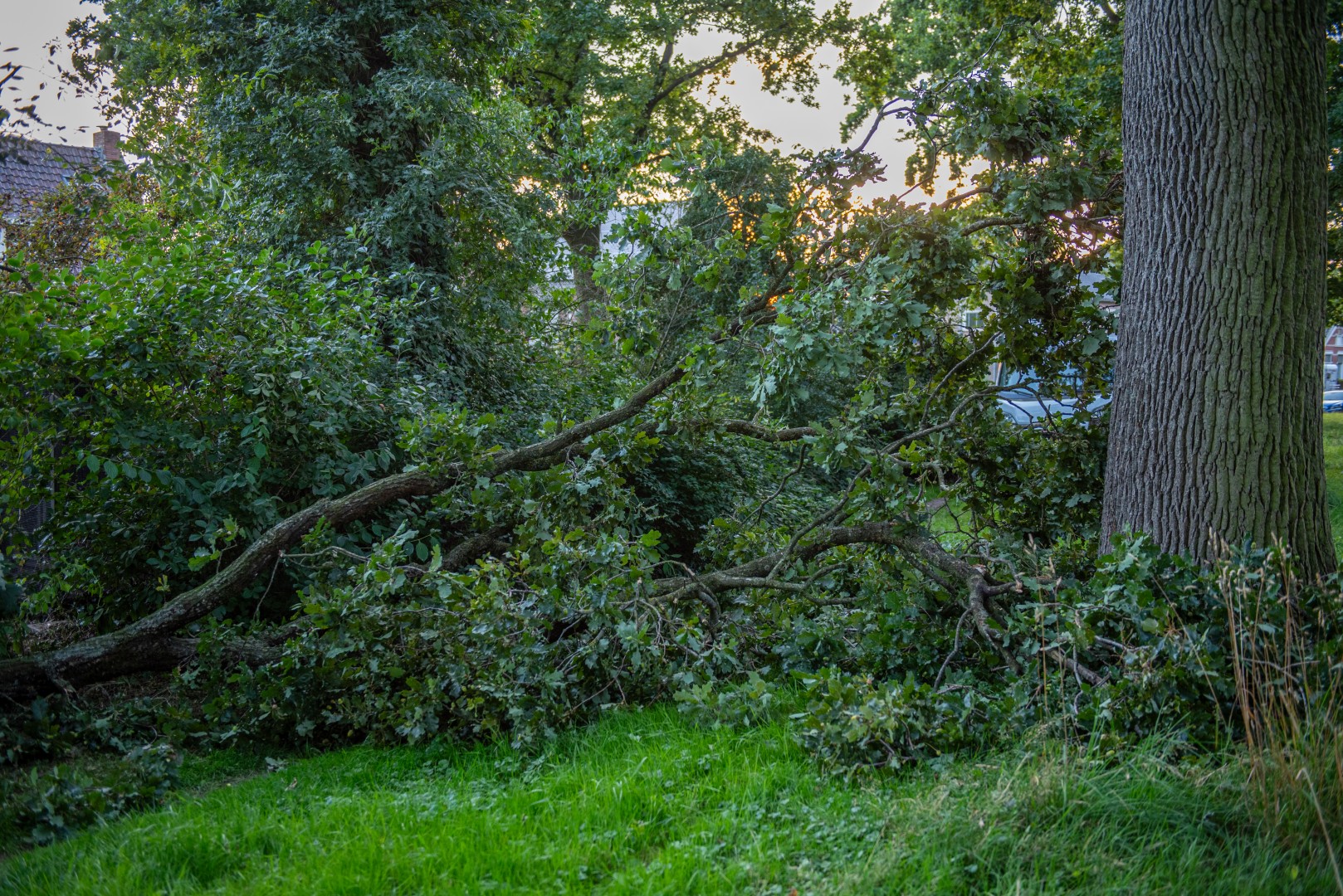 Een tak was daar afgebroken en richting een woning gevallen. Daarnaast hing er nog een losse tak die mogelijk op een schuur of woning terecht kon komen.