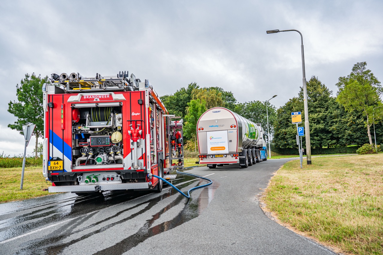 Na de inzet kon de vrachtwagen worden gecontroleerd en was er geen verder gevaar. De melkwagen liep geen zichtbare schade op.