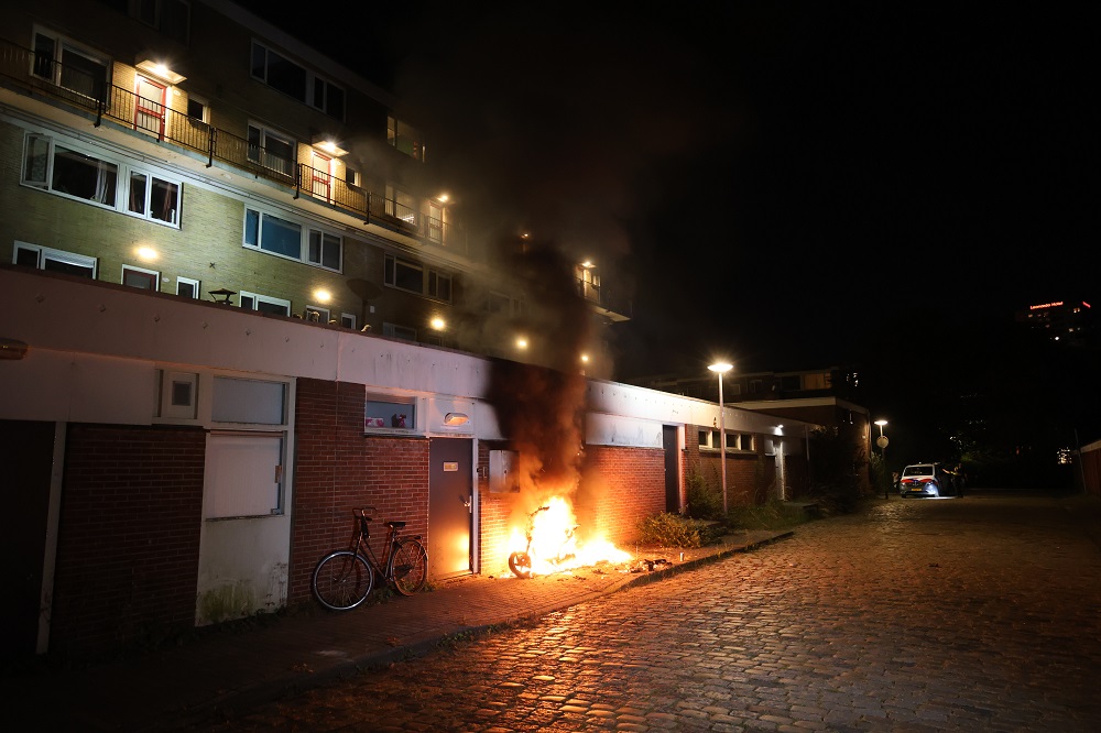 Zowel de scooter als de gevel van het gebouw raakten fors beschadigd. Over de oorzaak van de brand is nog niets bekend.