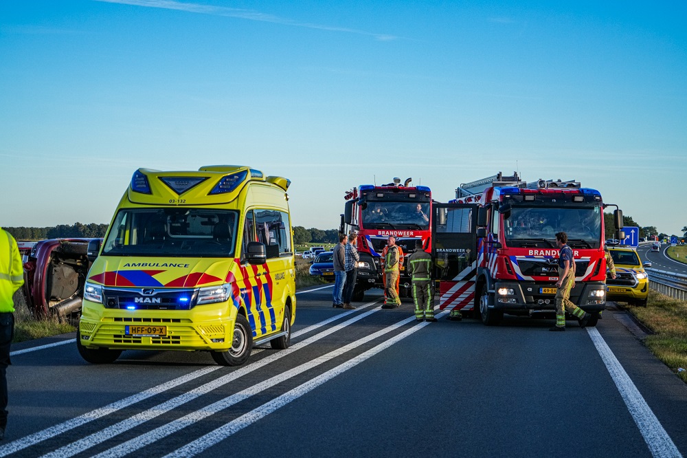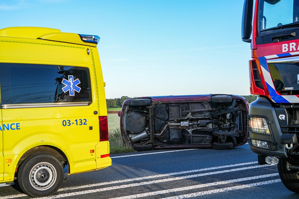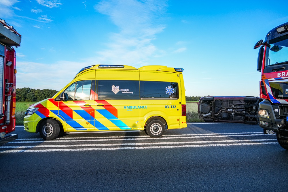 Een van de auto’s kwam op de zijkant terecht. Politie, brandweer en ambulance kwamen met spoed ter plaatse om hulp te verlenen.