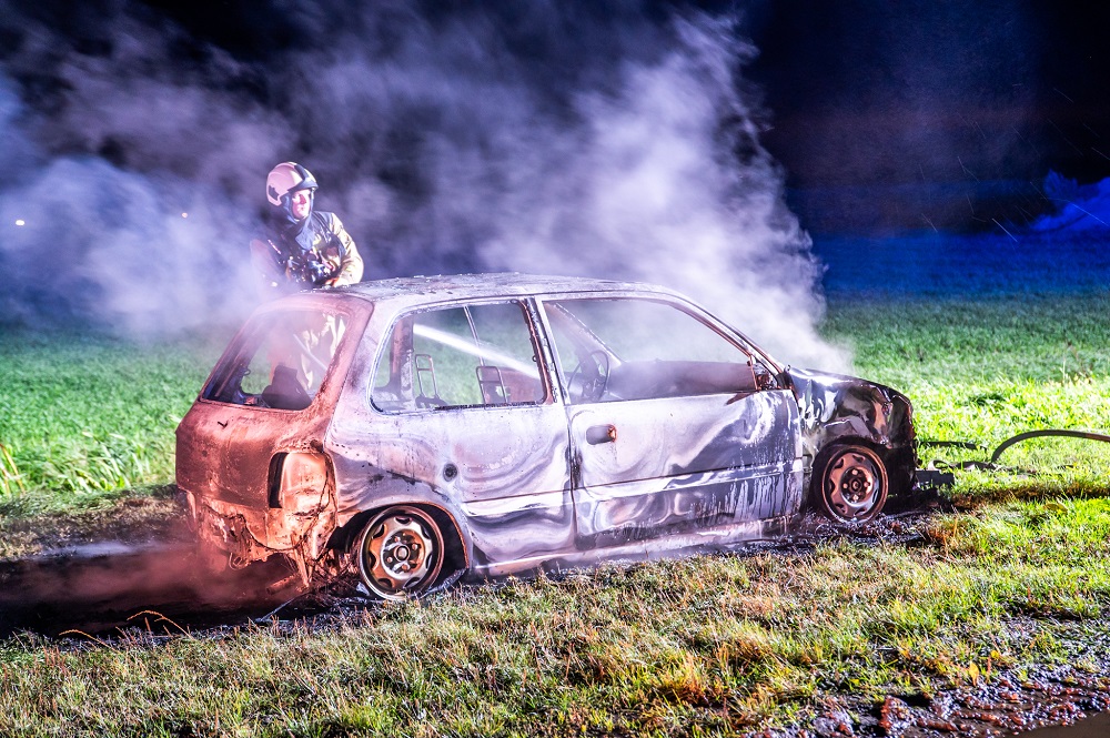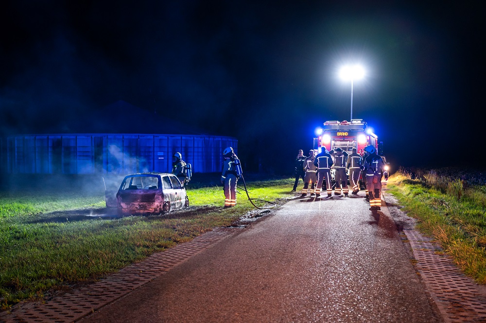 Bij aankomst stond het voertuig al volledig in brand. Ondanks een snelle inzet kon de brandweer de auto niet meer redden; het voertuig brandde volledig uit.