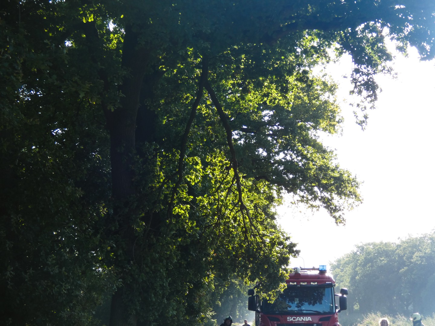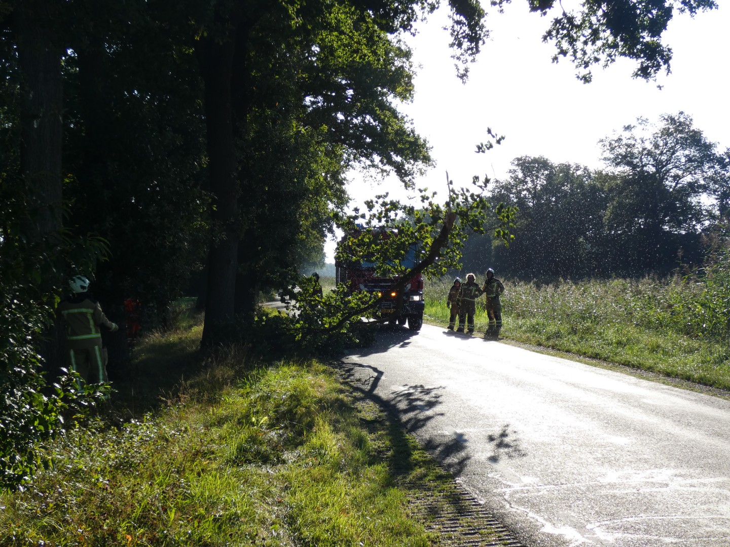 Met behulp van een lier aan het tankautospuit wist de brandweer de tak gecontroleerd uit de boom te trekken. De tak viel op de rijbaan en werd vervolgens in de berm gelegd.