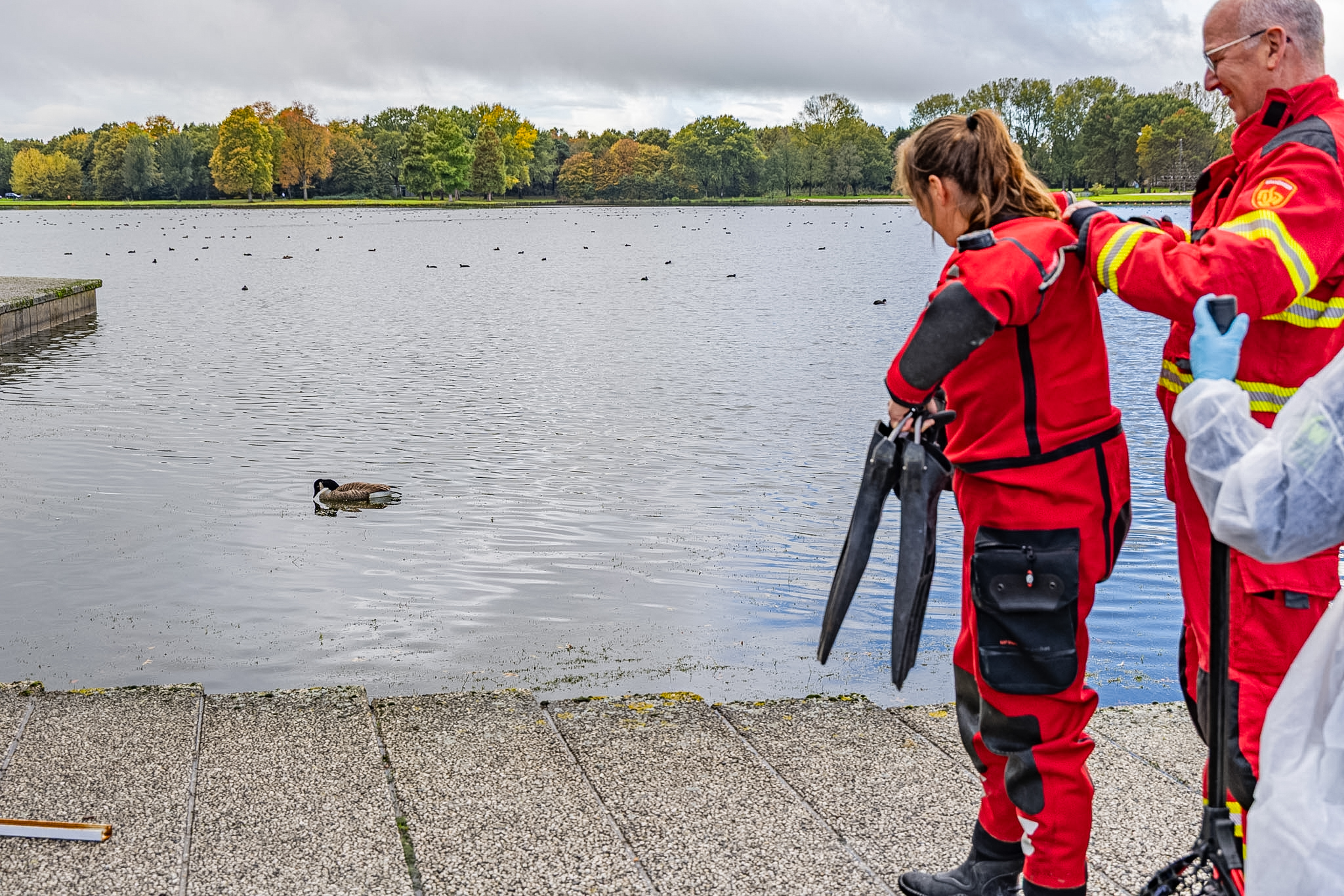 De dierenambulance kreeg een melding dat het dier in de problemen was geraakt. Pogingen om de gans te vangen liepen op niets uit, waarna de brandweer werd ingeschakeld. Een duiker ging het water in en wist het dier succesvol te benaderen en te vangen.