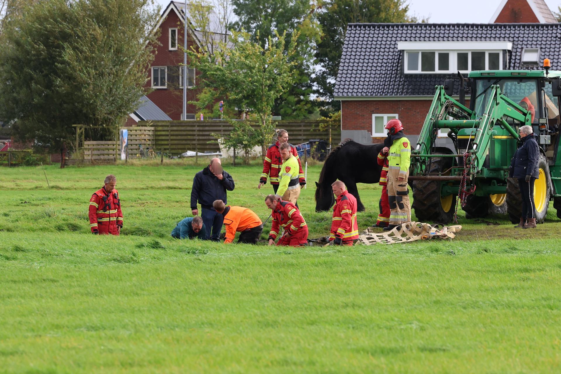 Met gezamenlijke kracht wisten de brandweer en de boer het paard weer op het droge te krijgen. Het dier leek na de redding niet gewond te zijn geraakt.