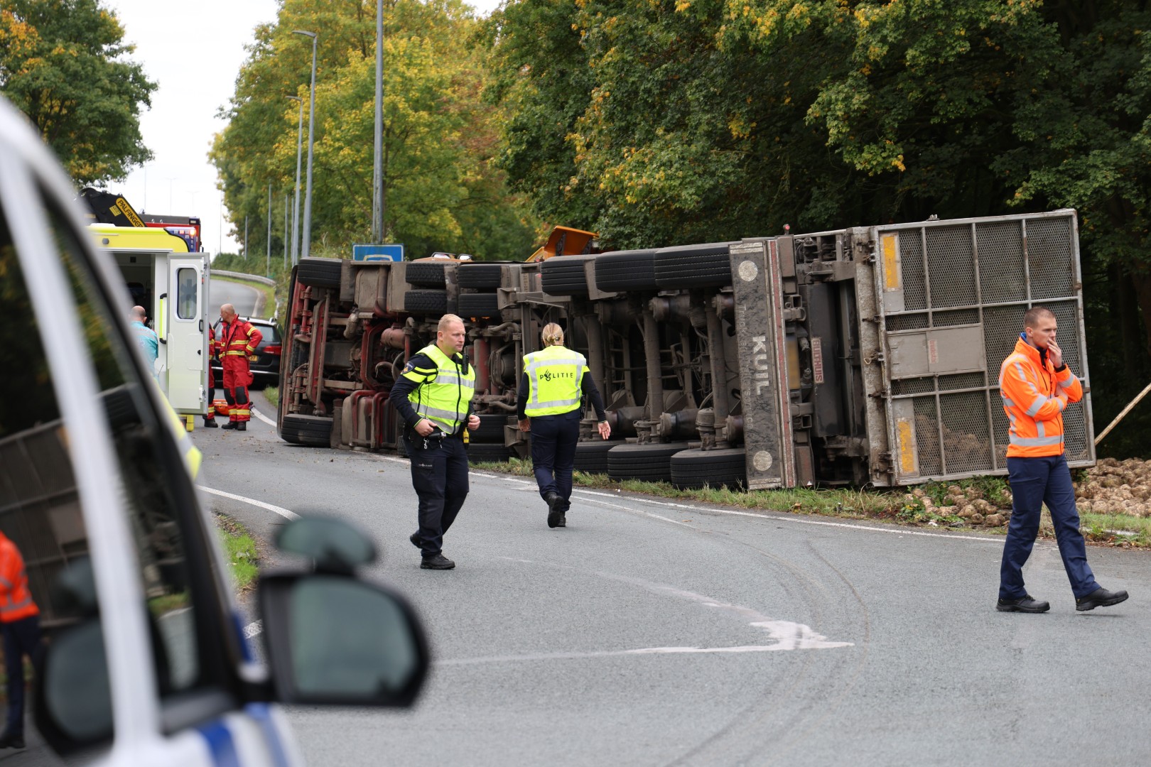 De hulpdiensten, waaronder politie, brandweer, ambulance en een traumahelikopter, werden rond 10.29 uur met spoed opgeroepen. Bij aankomst troffen zij een vrachtwagen aan die op zijn kant lag. De chauffeur wordt momenteel door de brandweer uit de cabine bevrijd.