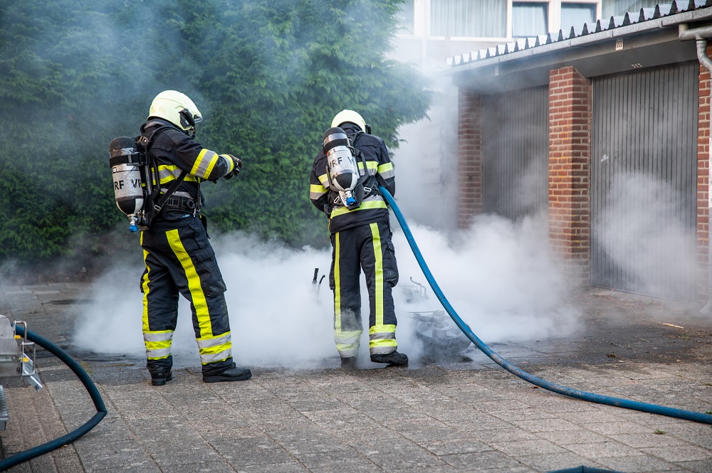 Het voertuig lag voor een rij garageboxen. Door snel ingrijpen wist de brandweer te voorkomen dat de vlammen oversloegen naar de garages.