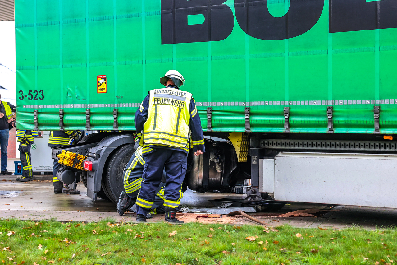 De brandweer is ter plaatse en pompt de diesel uit de tank van de vrachtwagen. De straat is volledig afgesloten voor het verkeer. De vrachtwagen wordt afgesleept door een eigen berger.